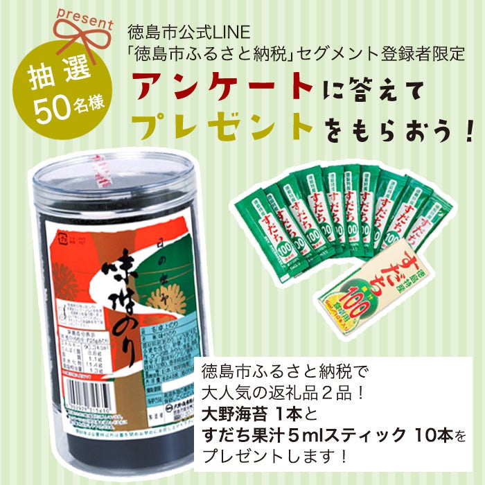 抽選で50名の方に、徳島市名産品セット(大野海苔1本・すだち果汁5mlスティック/10本入1箱)をプレゼント