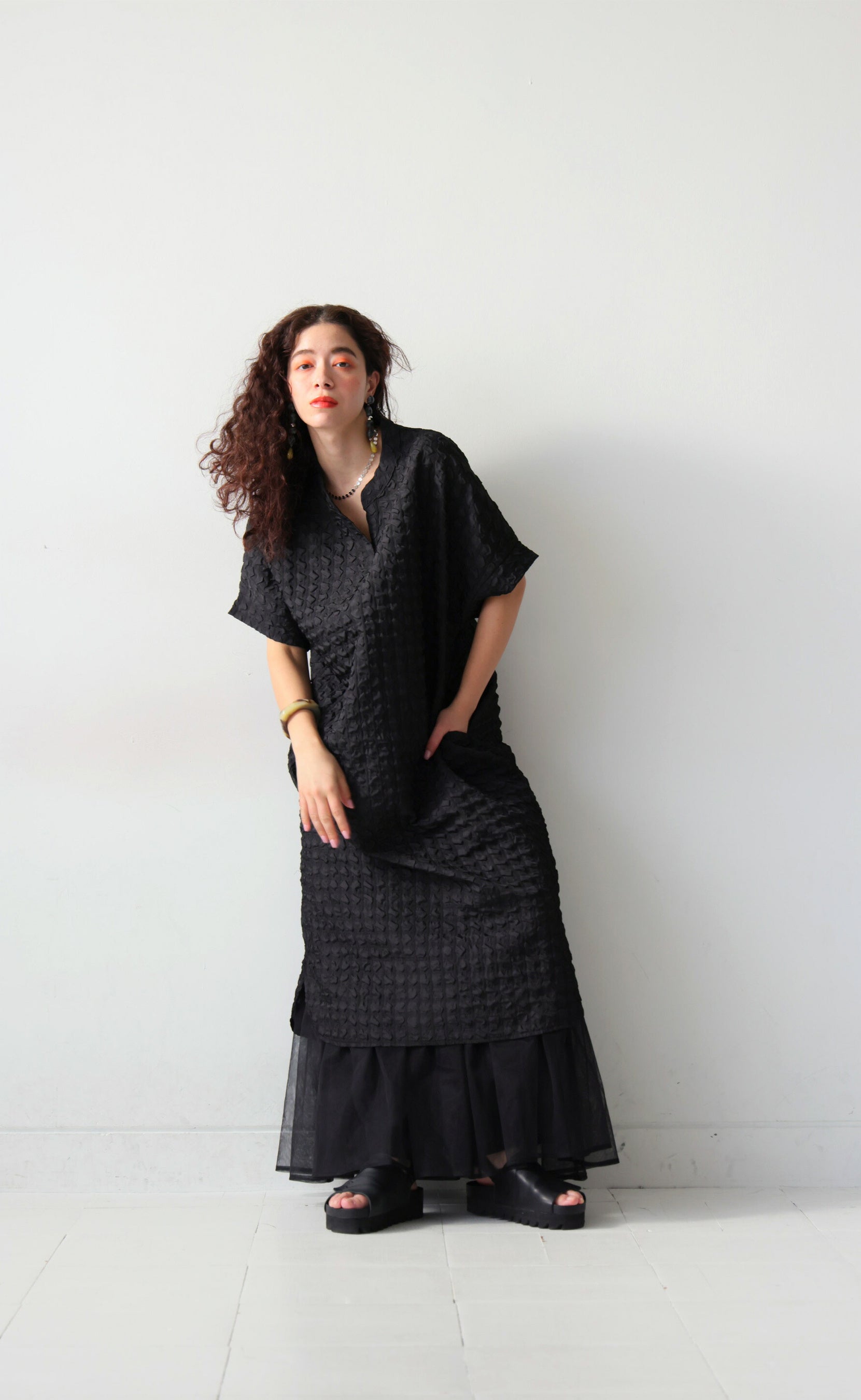 凹凸感のあるジャガード生地が表情豊かで洗練された印象に。モードな装いも難なく叶う、幅広いシーンで活躍するワンピース。