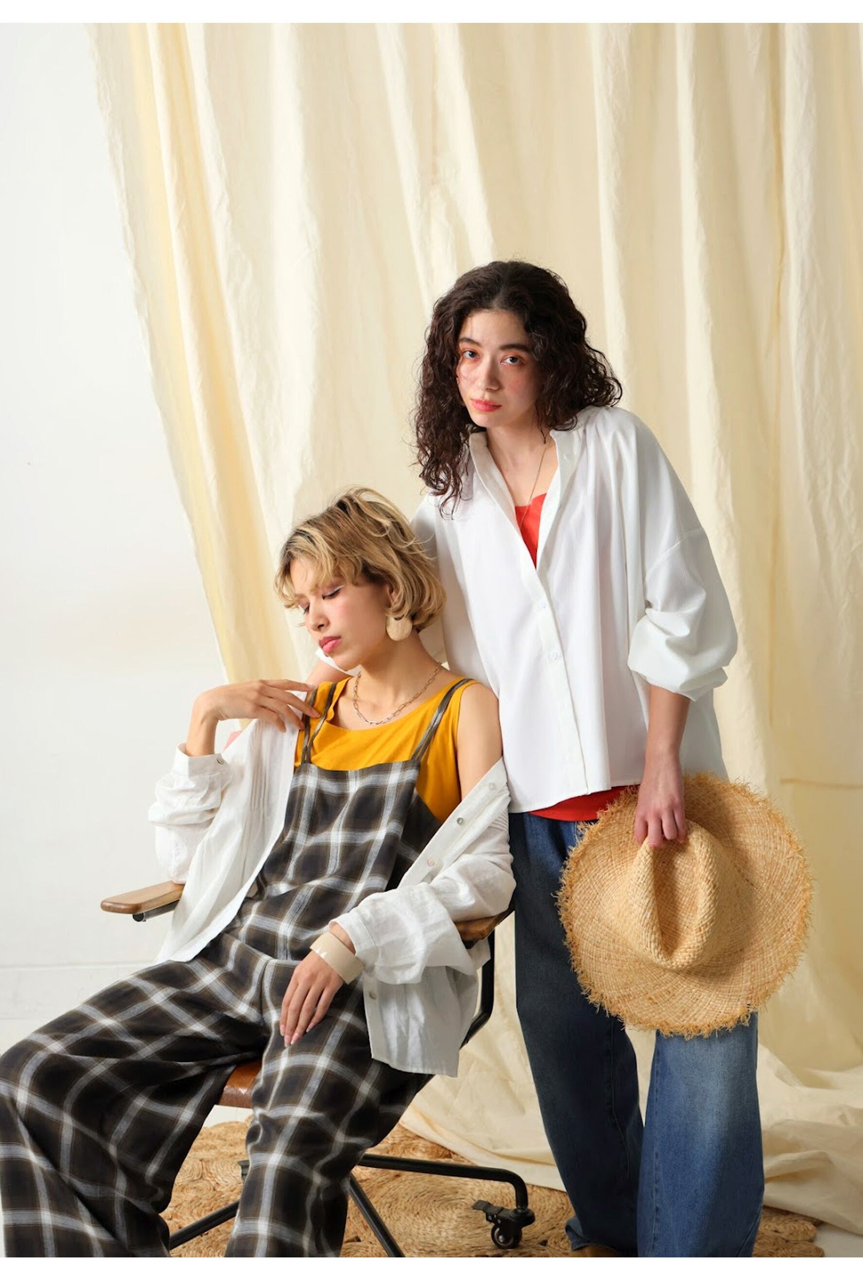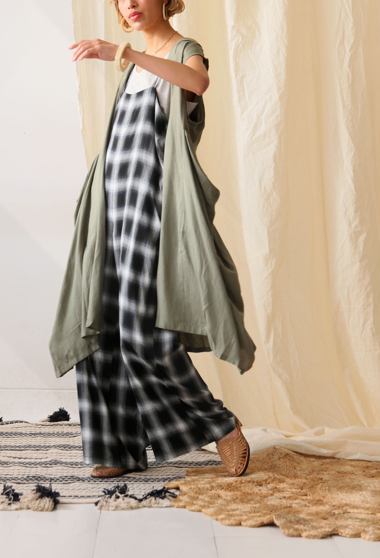 ニュアンスのある色使いが雰囲気たっぷり。一枚着るだけで大き目オンブレチェックがお洒落に効く、大人サロペット。