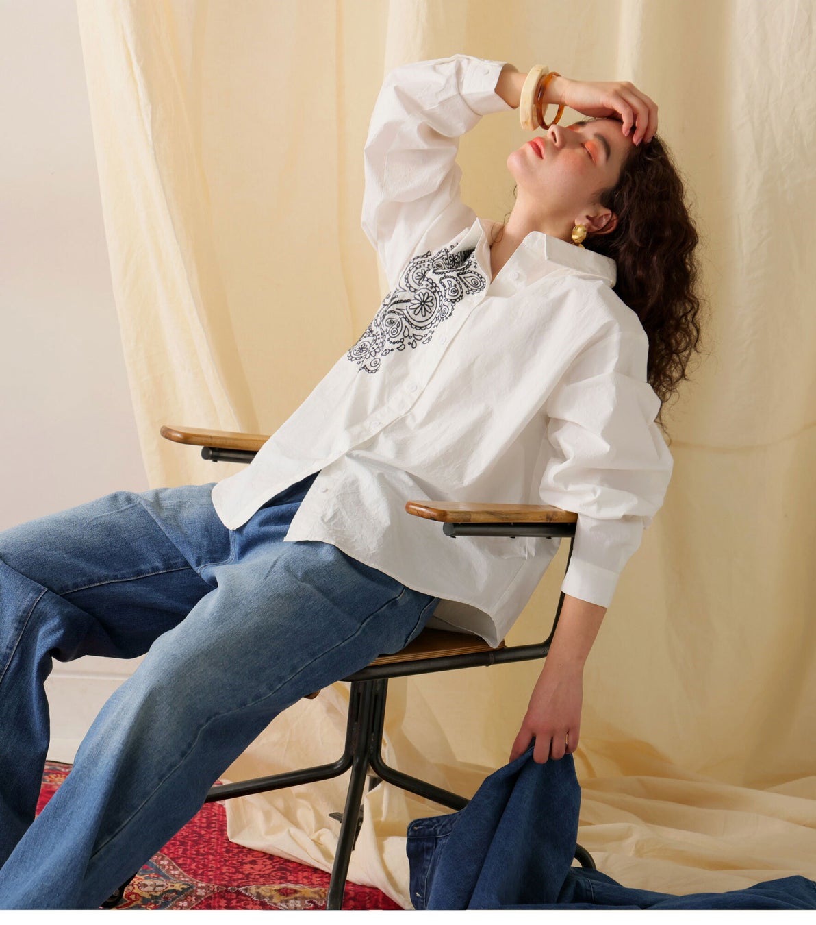 絶妙なバランスで配置された刺繍が装いに華やかさを。遊び心を取り入れつつ、こなれた雰囲気を演出してくれる。