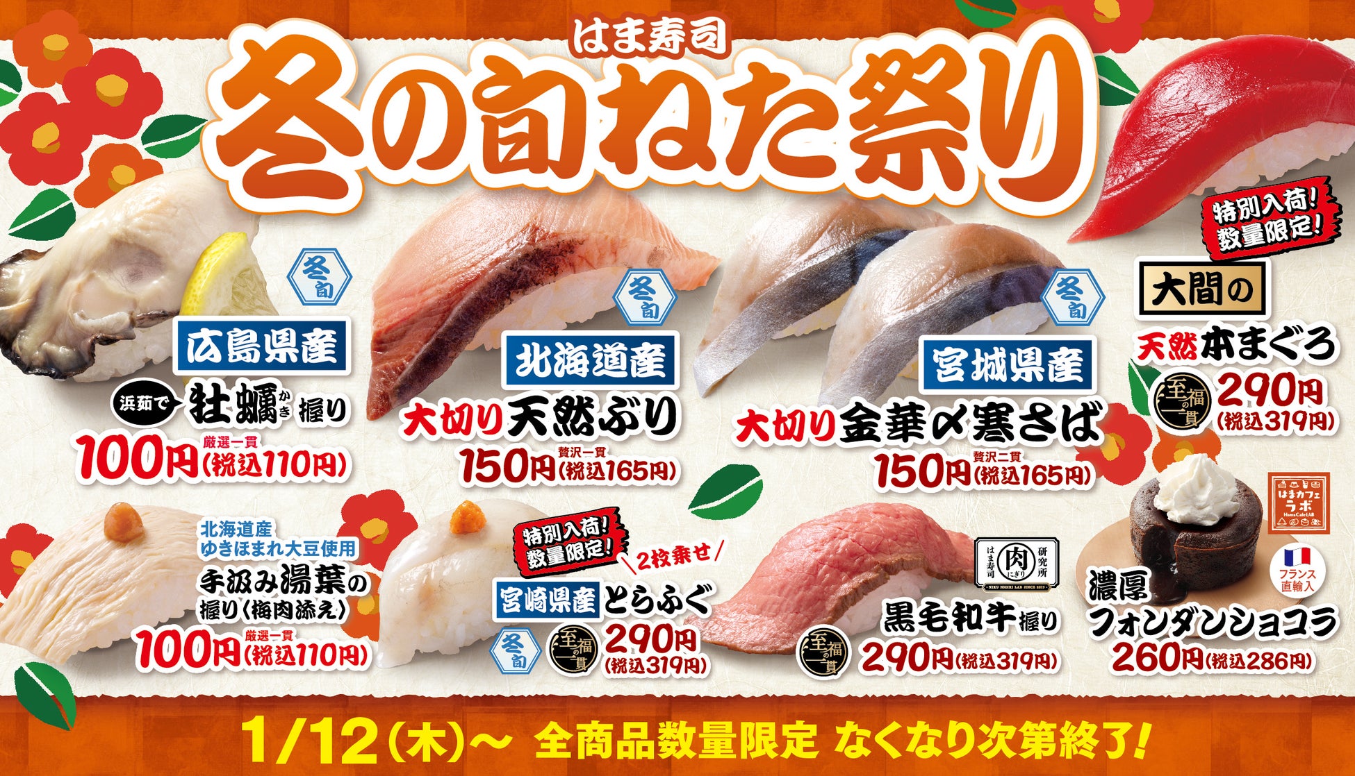 株式会社はま寿司(代表取締役社長:遠藤 哲郎 本社:東京都港区)が展開する100円寿司チェーン「はま寿司」は、1月12日(木)から「はま寿司 冬の旬ねた祭り」を全国の店舗で開催します。
