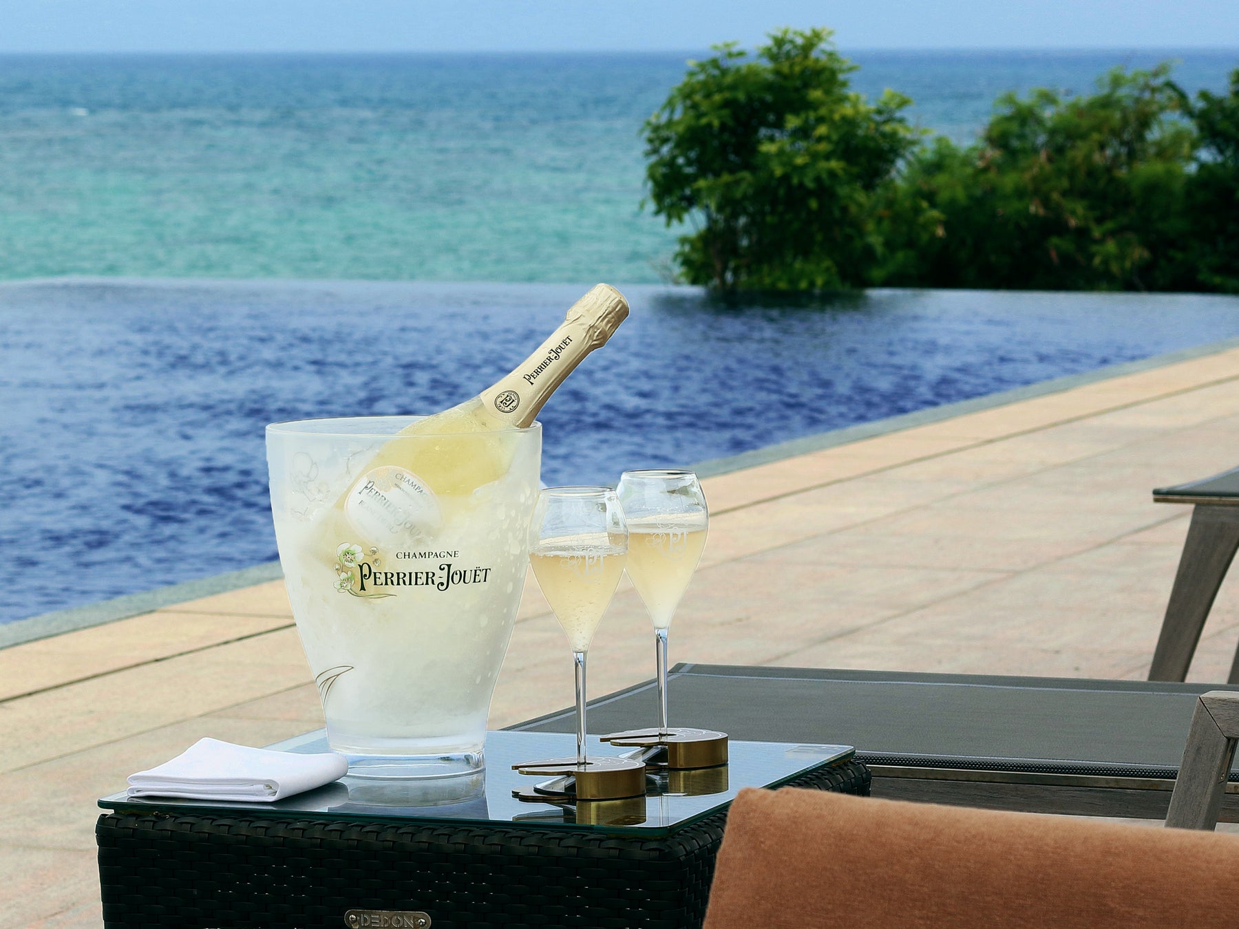 「HIRAMATSU HOTELS」×「ペリエ ジュエ」によるコラボレーションを今年も展開。沖縄・宜野座では、プールサイドでシャンパーニュを楽しむ優雅な時間も。