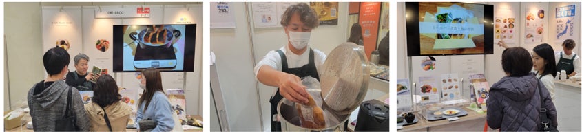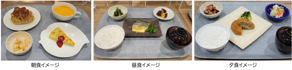 科学的根拠に基づいたLEOCならではの調理法で作るオリジナルメニュー(一日の献立をイメージ)として、朝食「アンサンブルエッグ」をはじめ、昼食「鯖の三種味噌煮」、夕食「メンチカツ」などを展示。その他には、形態食(ソフト食、ミキサー食、極きざみ食)のサンプルなどを展示中です。