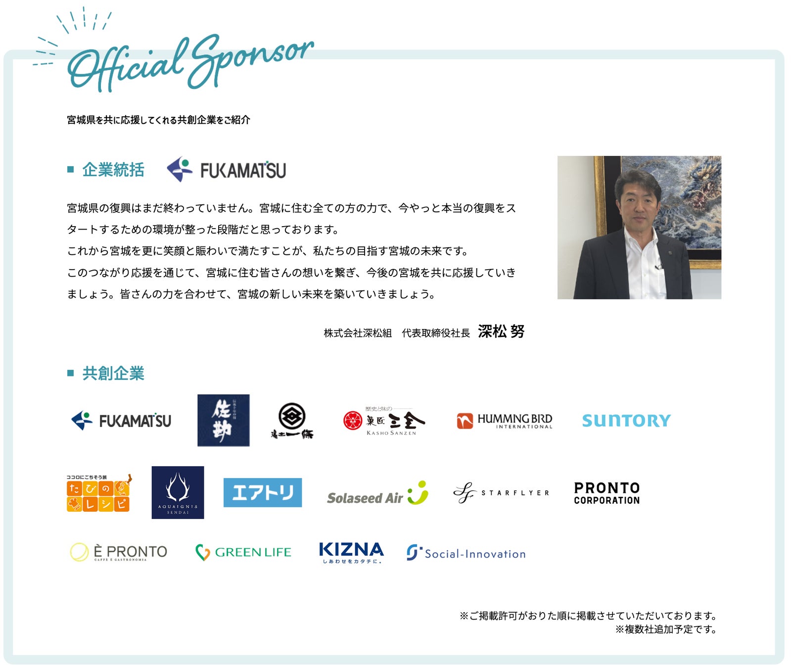 『企業統括』には『株式会社深松組 代表取締役社長 深松努氏』をお迎えし、県内の企業様(伝承千年の宿 佐勘、時音の宿 湯主一條、株式会社菓匠三全、ハミングバード・インターナショナル、サントリー株式会社 東北営業本部、株式会社たびのレシピ、アクアイグニス仙台など)のご支援のもと、連携して活動してまいります。