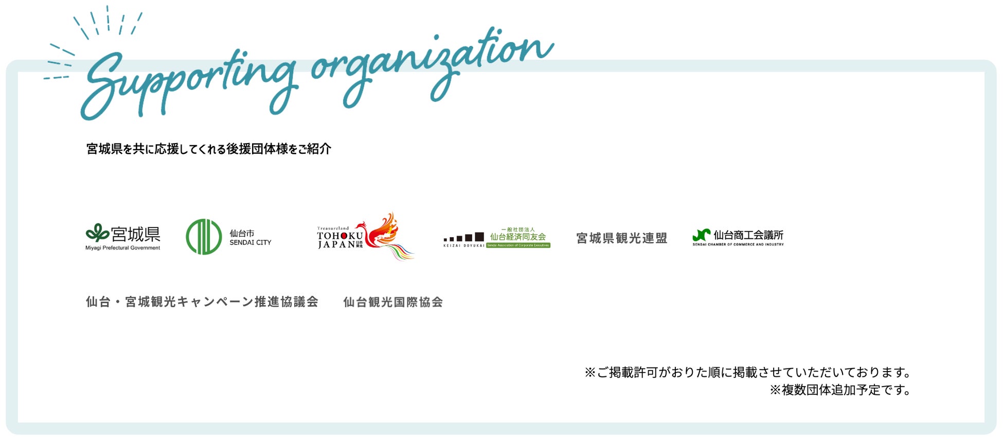 「宮城県」「仙台市」を筆頭に「一般社団法人東北観光推進機構」「一般社団法人仙台経済同友会」「宮城県観光連盟」「仙台商工会議所」「仙台・宮城観光キャンペーン推進協議会」「仙台観光国際協会」などにご後援いただいております。