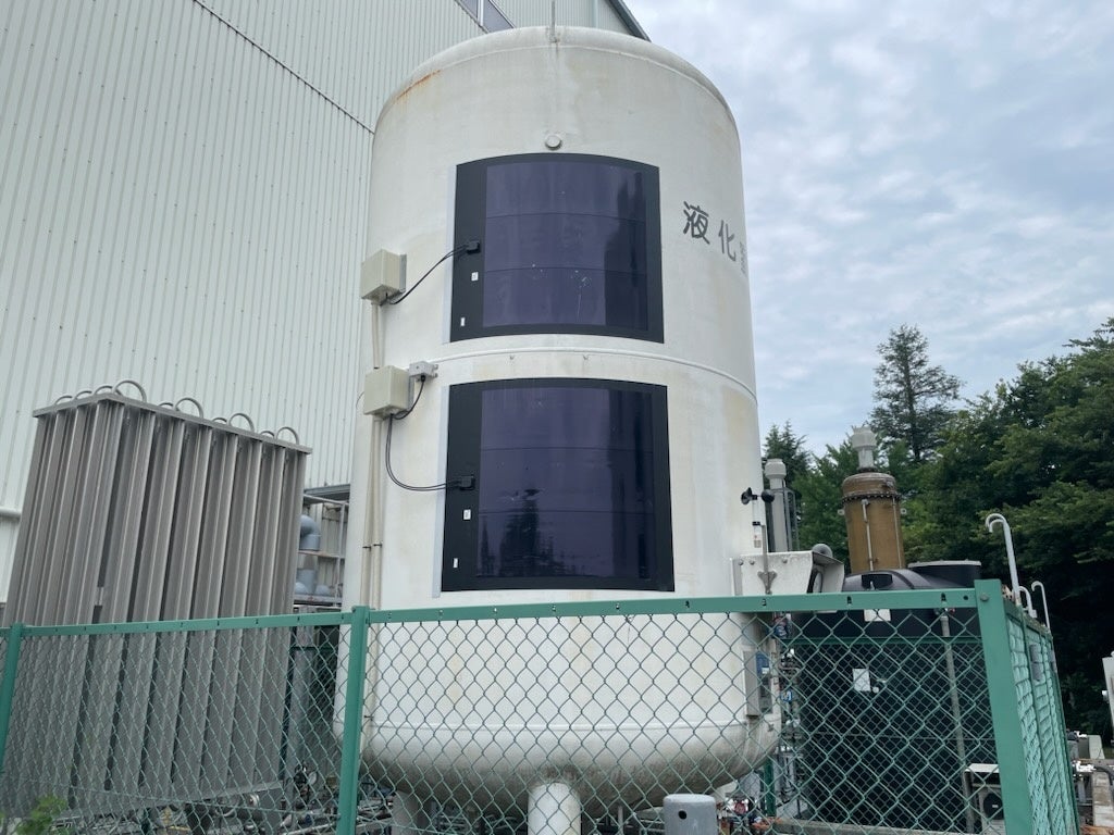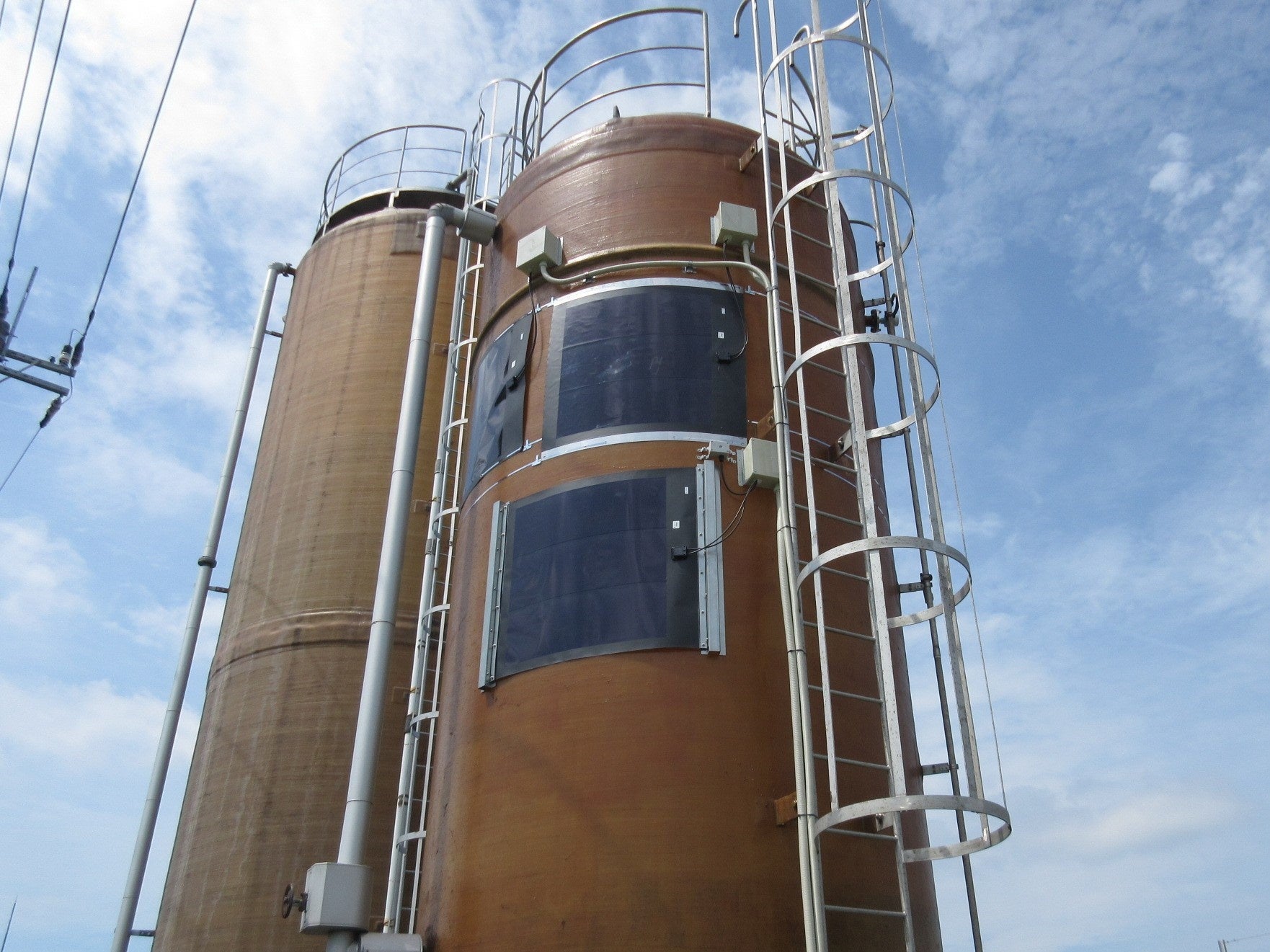 実証内容:事業所のタンク壁面を想定した、垂直曲面設備への設置・施工方法の検証と発電データの測定