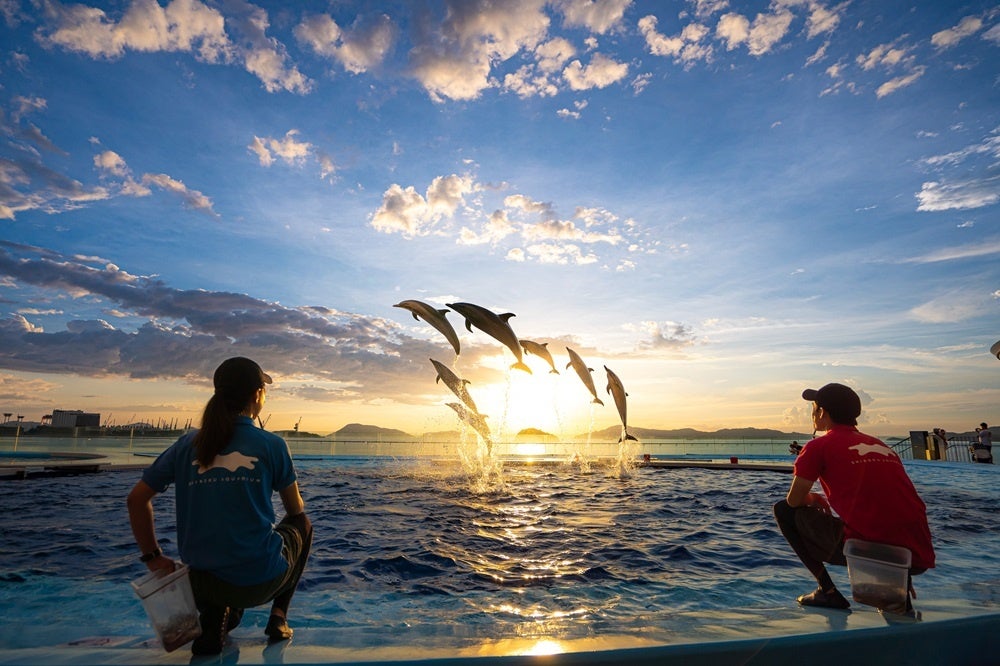 夜の水族館では、館内の水槽照明が深い青色に変化し、幻想的な雰囲気を演出します。夕暮れ時に開催するサンセットプログラムでは、黄金色に染まる空を背景にイルカのシルエットが浮かび上がる、まるで絵画のような景色をご覧いただけます。