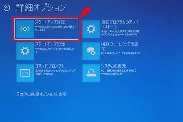 Step2:「トラブルシューティング」>「詳細オプション」を開きます。「スタートアップ修復」をクリックしてWindowsの読み込みを妨げている問題の修正を開始しましょう。