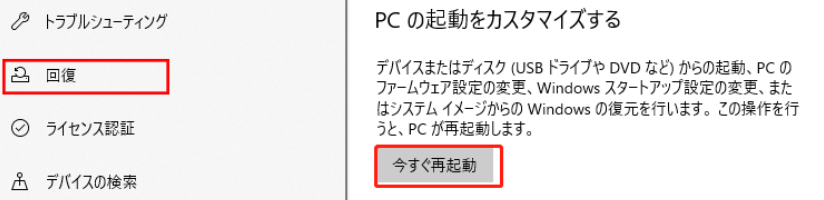 - パソコンが操作できる場合は「スタート」ボタンを押して「設定」から「更新とセキュリティ」を選び、「回復」の項目にある「今すぐ再起動」をクリックしてWindowsの回復環境を開きます。
