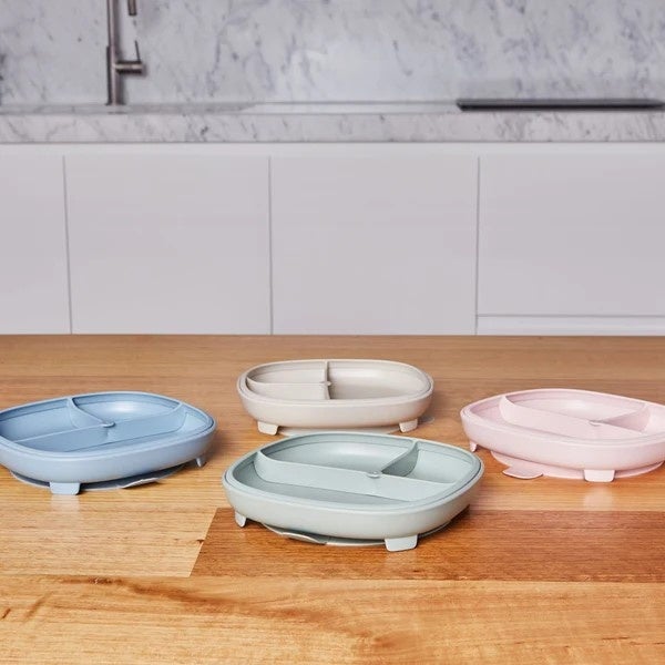 子どもの成長にあわせて中の仕切りや裏の吸盤を取り外して使えるお食事プレートです。冷たい食べ物、温かい食べ物どちらも盛り付け可能で、離乳食初期の液体状のものから固形のおやつまで、あらゆるお食事に対応します。