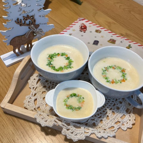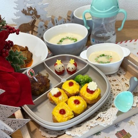 ころっとまんまるオムライス、ハンバーグ、ポテサラサンタ、リース模様のコーンクリームスープ