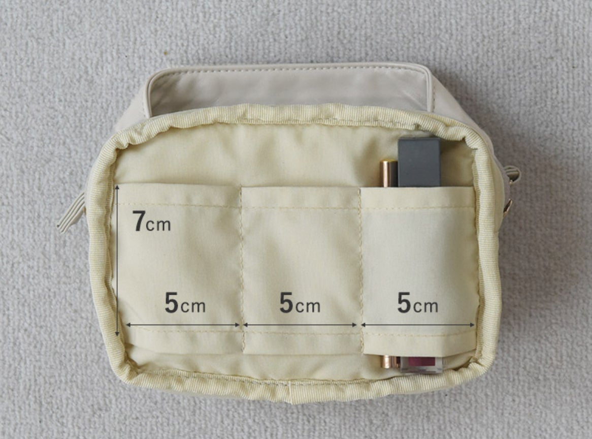 ポーチ内外に複数のポケットや仕切りを付け、細々としたコスメもすっきり整理できる設計に。