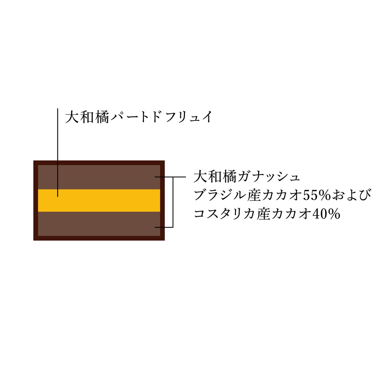 大和橘の葉や皮が持つ特有の香り、渋みを抽出しフルーティーな味わいのブラジル産カカオ55%とコスタリカ産カカオ40%のショコラと合わせた個性的なガナッシュと清冽な酸味のある果汁を凝縮したパートドフリュイ