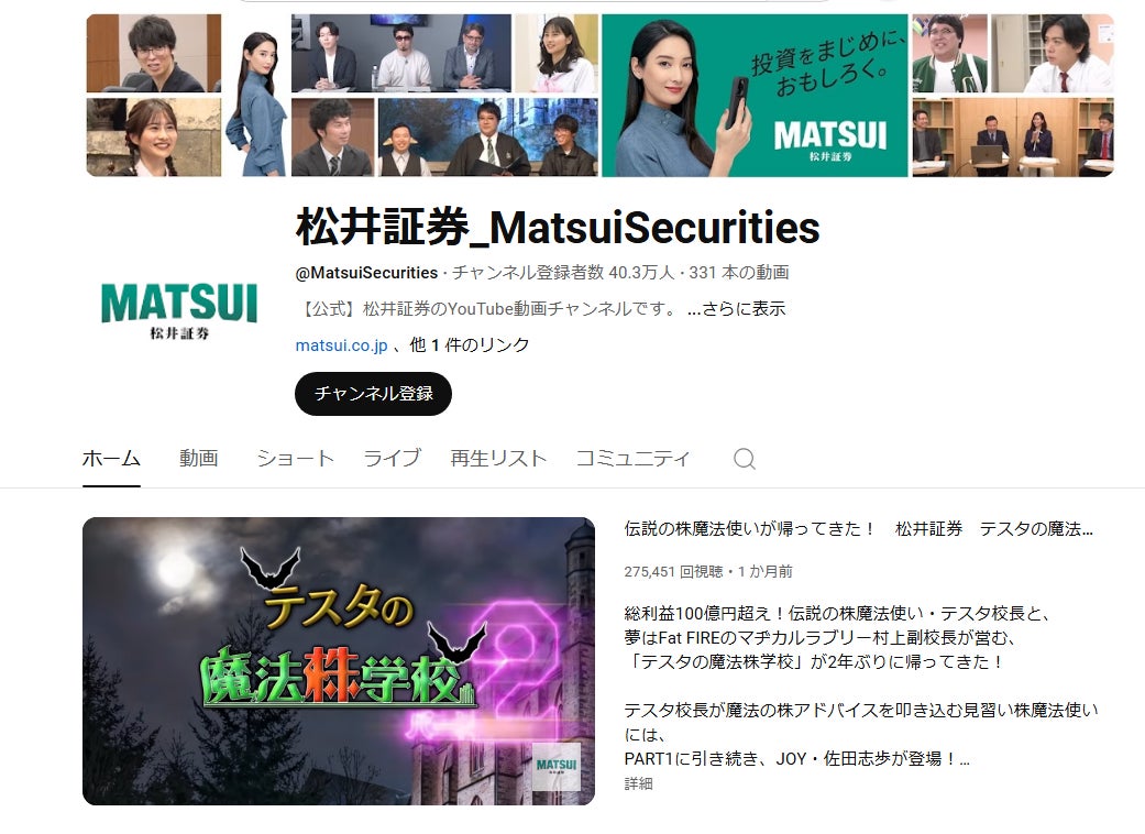 また、松井証券YouTube公式チャンネルでは、2024年12月に登録者数40万人を突破いたしました。今後も多くの方に投資の楽しさ、おもしろさを体験していただけるような動画を配信してまいりますので、引き続き、松井証券YouTube公式チャンネルにご注目ください。