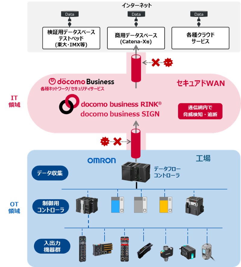 オムロン株式会社(本社:京都府京都市、代表取締役社長:辻永 順太、以下「オムロン」)とNTTドコモビジネス株式会社(旧NTTコミュニケーションズ株式会社、本社:東京都千代田区、代表取締役社長:小島 克重、以下「NTTドコモビジネス」)は、Catena-X*1等データスペース活用によるサプライチェーン間での安心・安全でスムーズな企業間グローバルデータ連携の実現をめざし、製造現場(Operational Technology、以下OT)と外部ネットワーク(IT)を連結した「セキュアデータ連携ソリューション」提供に向けて、両社の連携(以下、本連携)を開始しました。
