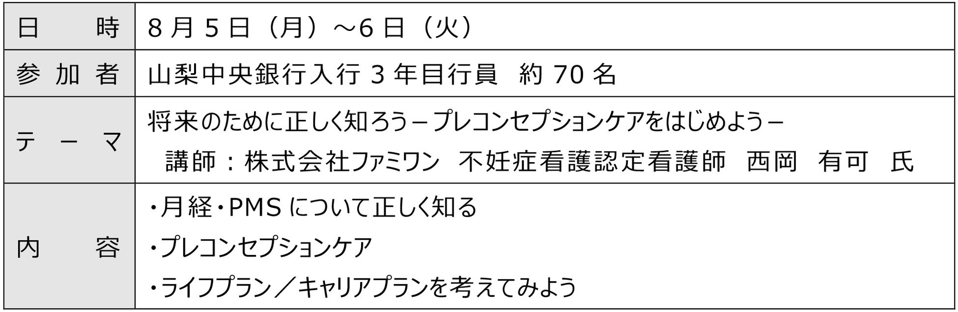 株式会社山梨中央銀行(頭取 古屋 賀章)は、山梨県と連携し、当行入行3年目の行員を対象とした「プレコン啓発セミナー」を開催いたしました。
