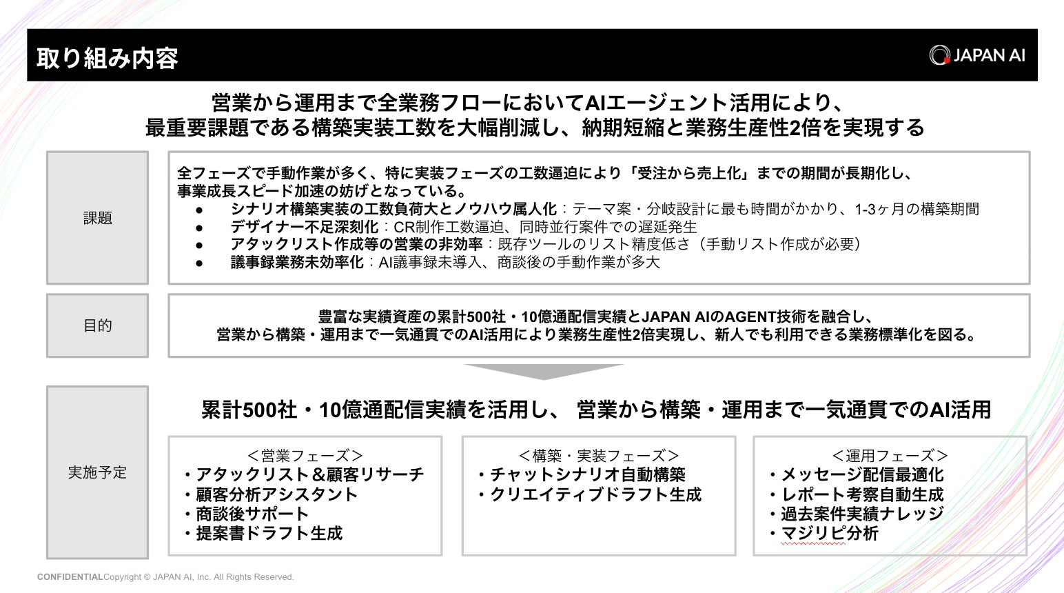 JAPAN AI株式会社(本社:東京都新宿区、代表取締役社長:工藤 智昭、以下JAPAN AI)は、DOTZ株式会社(本社:東京都目黒区、代表取締役社長 稲益 仁、以下DOTZ社)と連携し、JAPAN AIの最先端AI技術を活用した業務効率化支援を開始することをお知らせいたします。