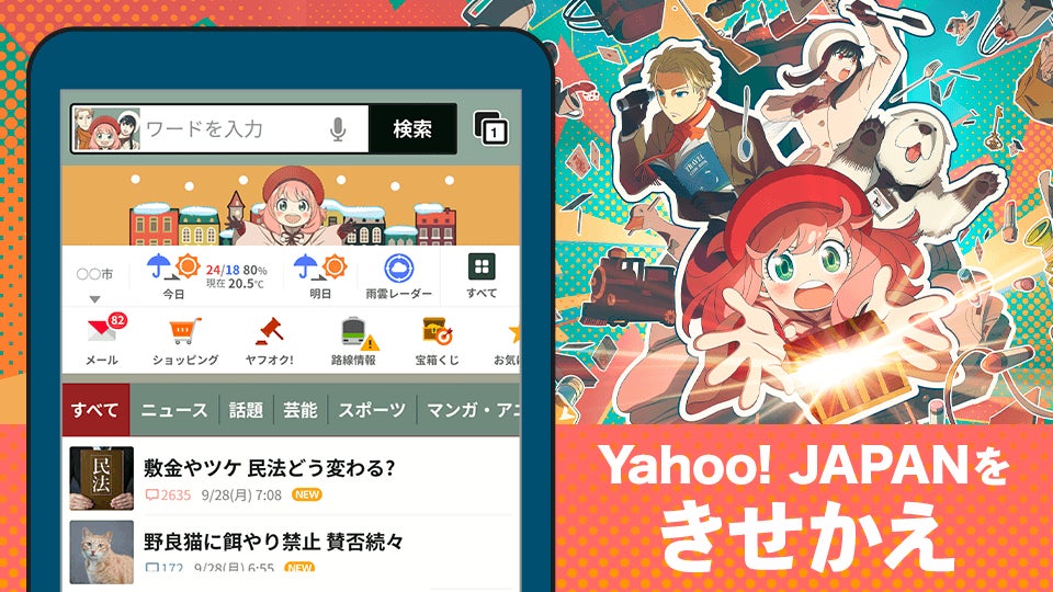 ・内容:「Yahoo! JAPAN」アプリ(iOS版、Android版)、スマートフォンブラウザ版「Yahoo! JAPAN」のトップページと検索結果ページを『SPY×FAMILY』特別仕様のデザインに無料できせかえられます。