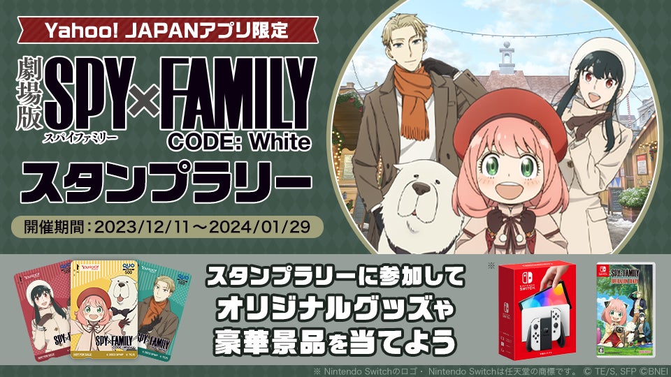 ・内容:「『劇場版 SPY×FAMILY CODE: White』のテーマにきせかえる」「おみくじを引く」など、本特集コンテンツのさまざまなミッションをクリアすることでスタンプを獲得できます。「アーニャ&ボンド」「ロイド」「ヨル」のそれぞれのキャラクターをあしらった「Yahoo! JAPANオリジナルQuoカード500円分」や、「Nintendo Switch(有機ELモデル)ホワイト※1&『SPY×FAMILY OPERATION DIARY』ゲームソフトセット」が当たる抽選に、スタンプ1個につき1回、最大で9回応募できます。また、スタンプを5個ためると、もれなくスマートフォン用のオリジナル壁紙が専用ページからダウンロードできます。