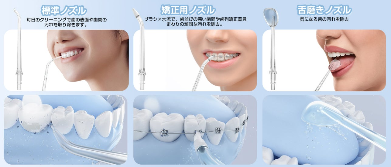 この口腔洗浄器は、標準ノズルに加えて、舌用や矯正用ノズルが付属しており、使い分けが可能です。特に矯正中の方にとって、矯正用ノズルが非常に便利で、歯の表面やワイヤー周辺に溜まりやすい汚れをしっかりと取り除くことができます。これにより、矯正中でも快適に口腔ケアが行えます。