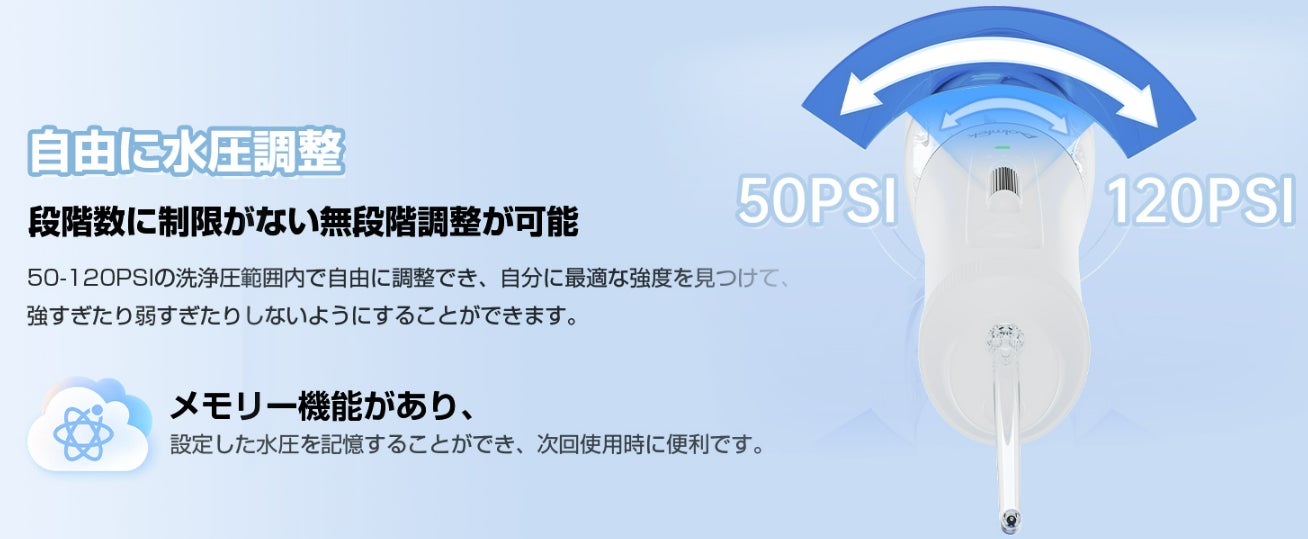 Aolmfekの口腔洗浄器は、水圧を無段階で調整できるため、自分の好みに合わせた水流で使うことができます。水流が細く集中的に歯の表面に当たることで、99.9%の汚れを除去でき、しっかりとした洗浄力を実感できます。「水圧を細かく調整できる点が便利」「ノズルが細く、動かしやすいため、使いやすい」といった声も多く、使い心地の良さが高く評価されています。