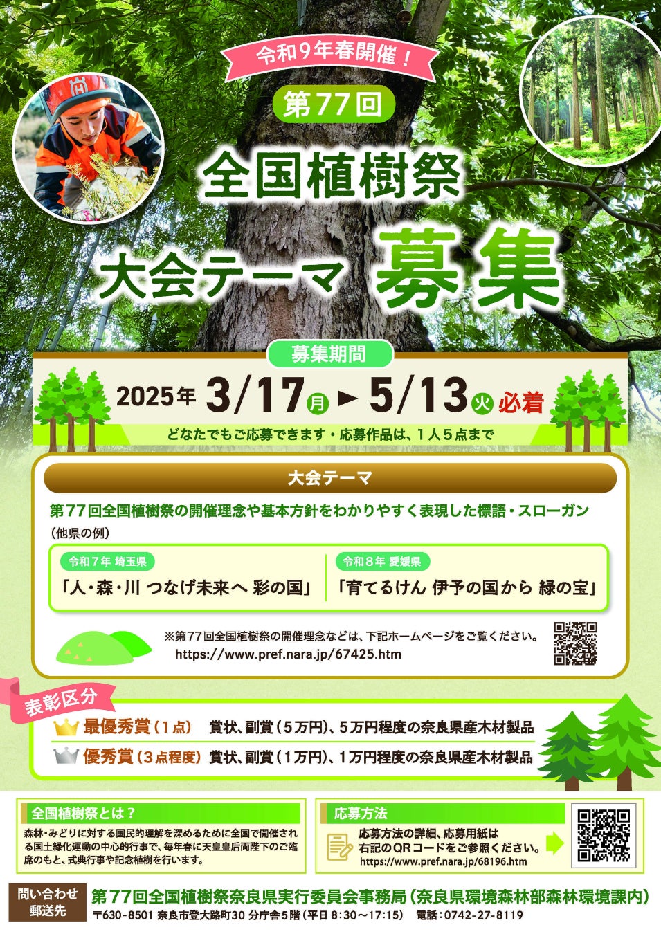 令和9年(2027年)春に奈良県で開催する第77回全国植樹祭を広く全国に周知し、開催機運を高めるため、開催理念等を簡潔に表現する「大会テーマ」を募集します。