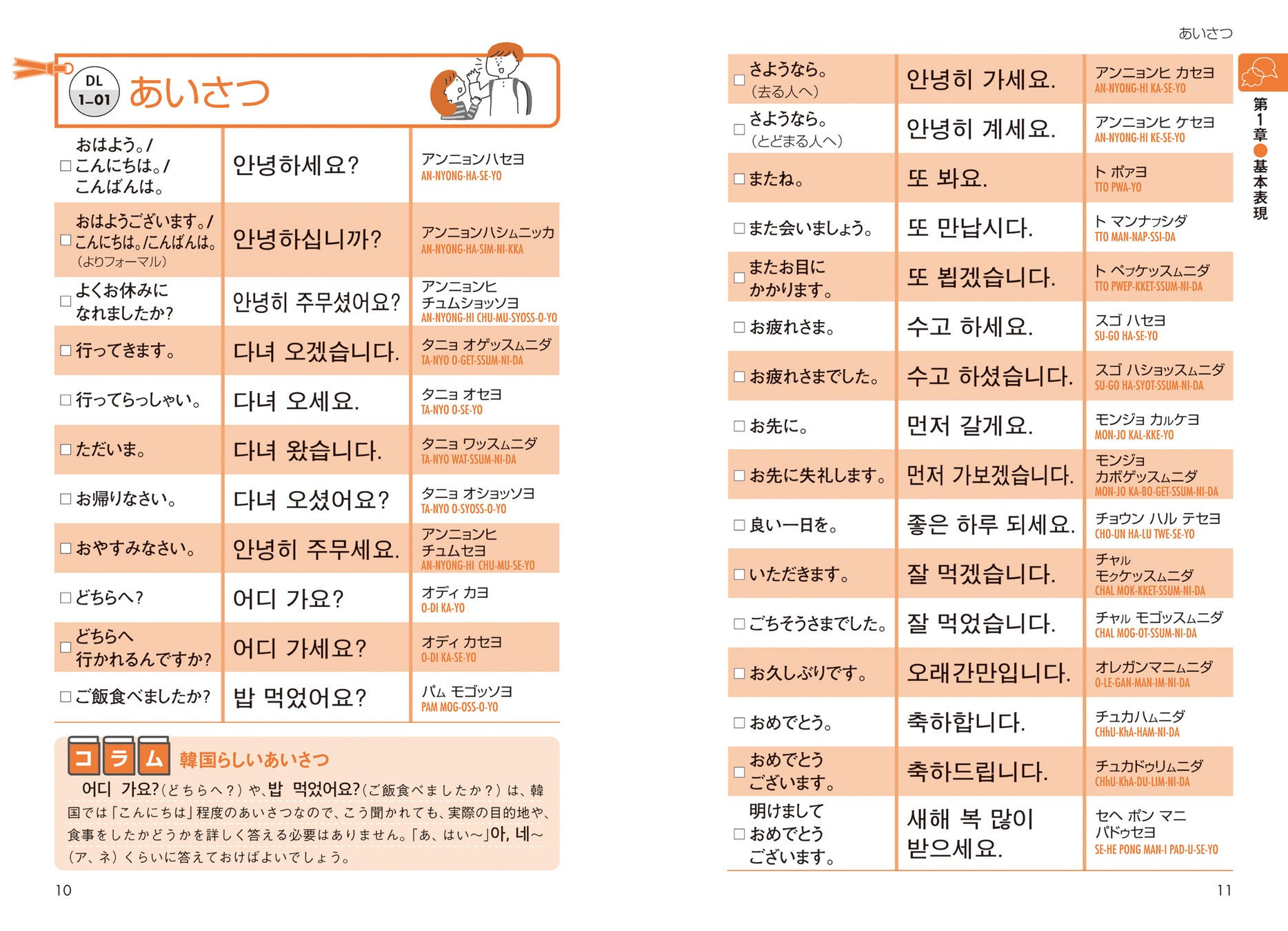 イラストを見ながら、単語を覚えられるページを収録。単語を入れ替えて使える便利な表現や、様々なシーンで役立つフレーズも豊富に掲載しています。また、韓国の文化、風習、通貨や交通など、現地情報がわかるコラムも充実。巻末では、最低限知っておきたいハングルの基本や文法をコンパクトに解説しました。