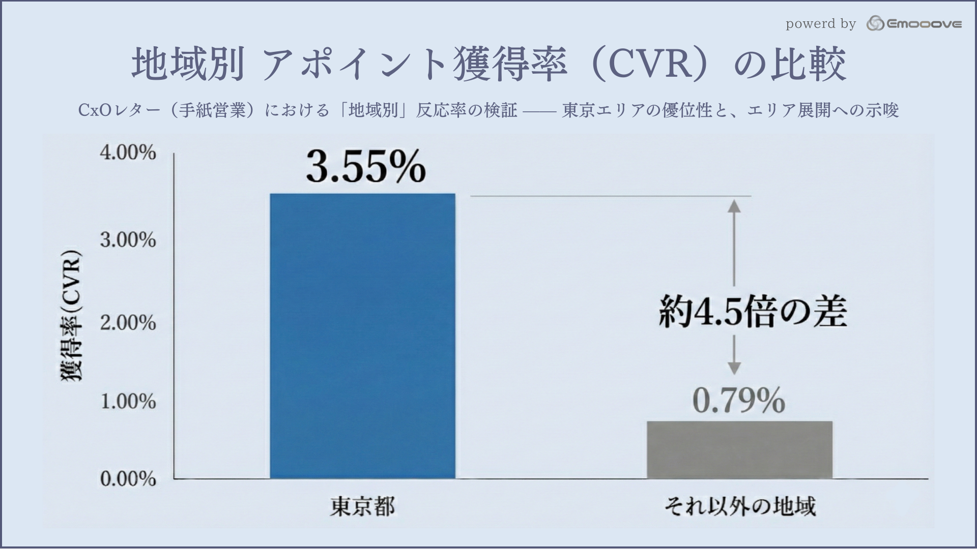 新時代の営業手法を提案する株式会社Emooove(本社:東京都品川区、代表取締役CEO:藤澤諒一)は、同社が運営するオウンドメディア「シン・セールス総合研究所」において、決裁者向けCxOレター(手紙営業)における「地域別の反応率差異」に関する分析レポートを公開しました。