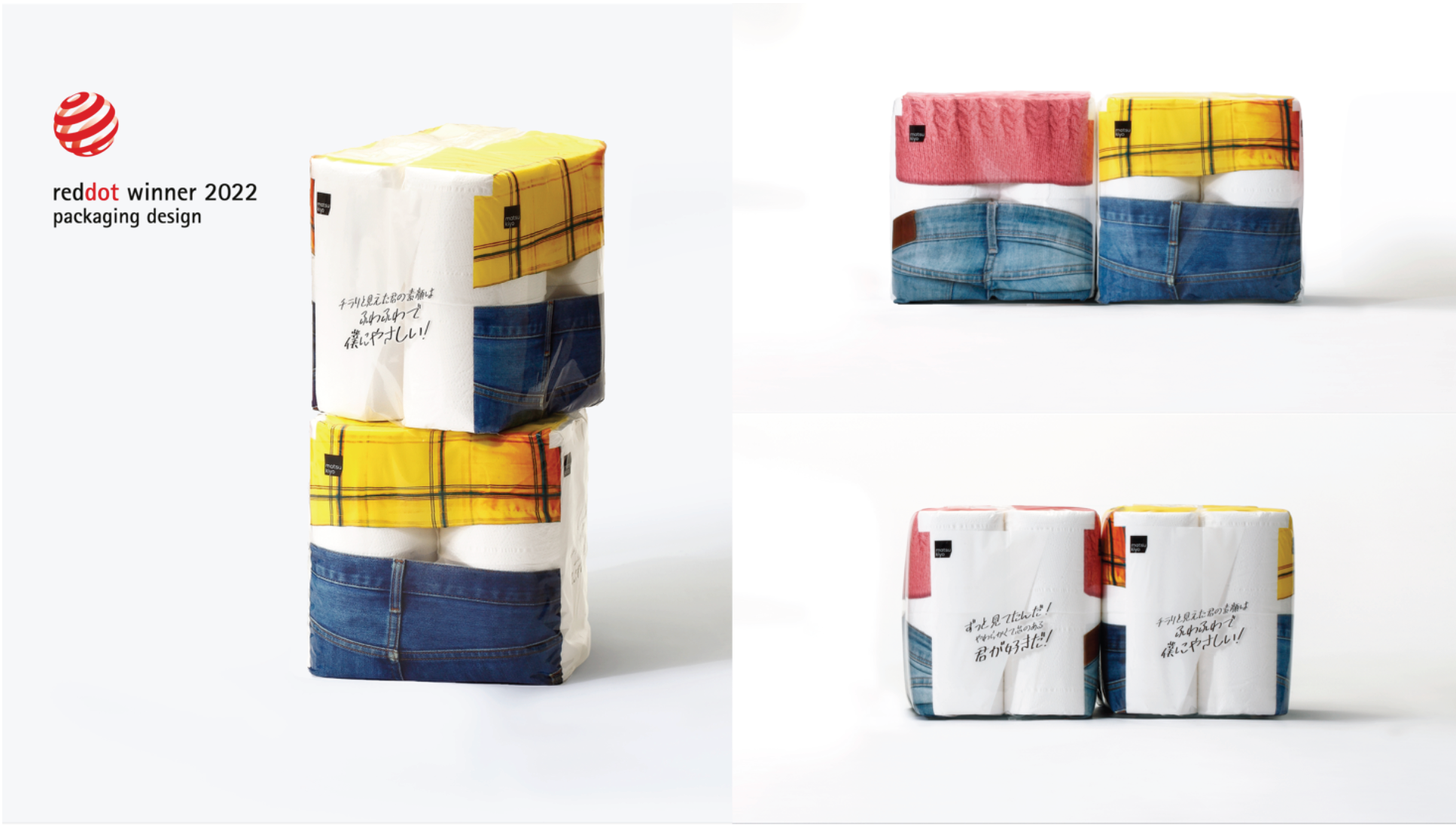白いトイレットペーパーのロールが二つ並んでいる様が、まさに使用するお尻の形に似ていることに着目し、しゃがみ込んだ状態でボトムスの上から少し覗くお尻に見立てるため、パッケージに洋服を着せるかのようにデザインしました。生活者に難しいことを考えさせることなく、ブランドのパーソナリティを持ってコミュニケートするプロダクトブランドの新しい有り様を目指しました。