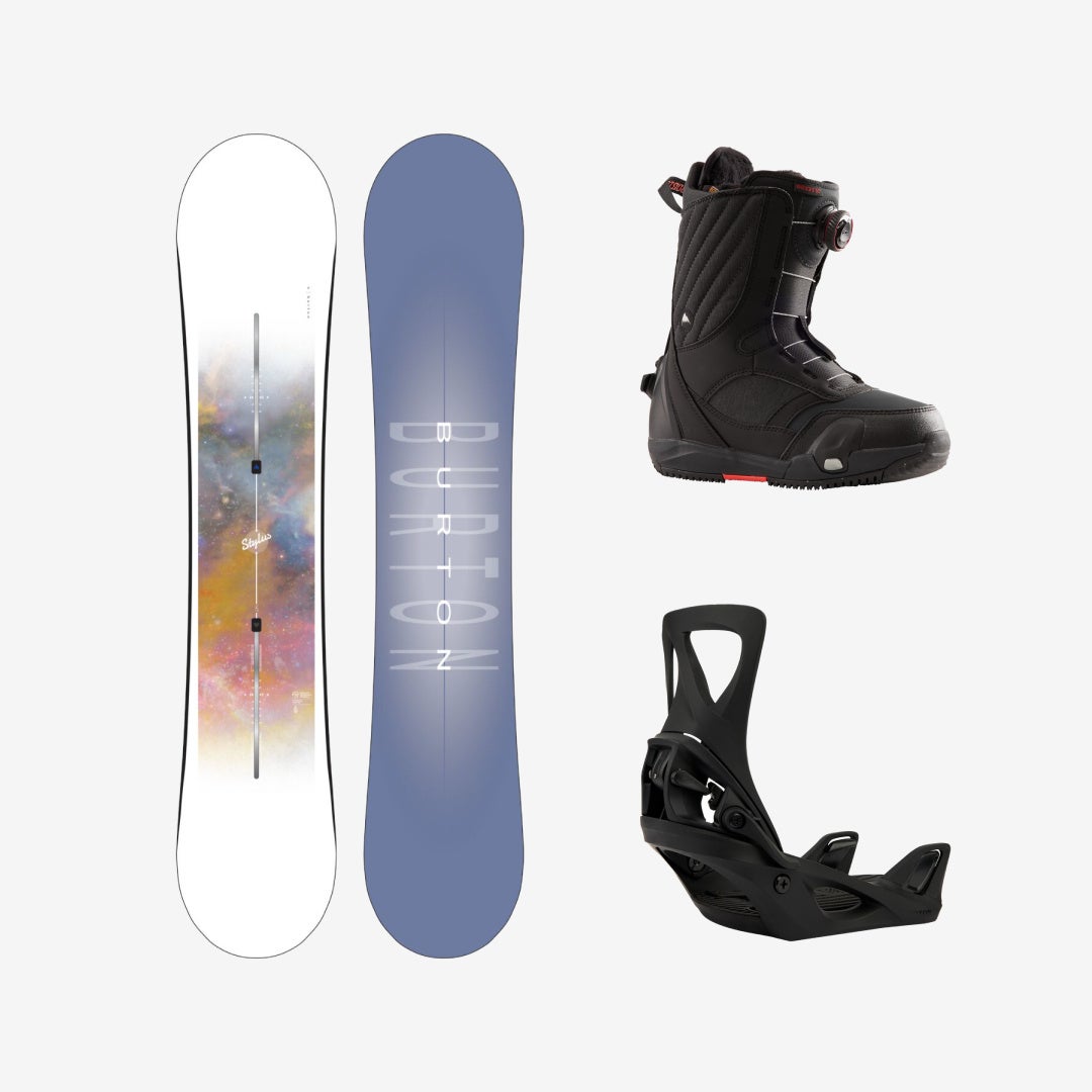 ウィメンズ用エントリーモデルとして人気のスタイラスは、ソフトフレックスで逆エッジを防ぐ構造を備えたオールラウンドボードです。足まわりには、ストラップタイプのバインディングより素早く簡単に着脱できるSTEP ON®︎を用意しました。はじめてのスノーボードをより快適に、そして滑る楽しさを味わえるセットです。