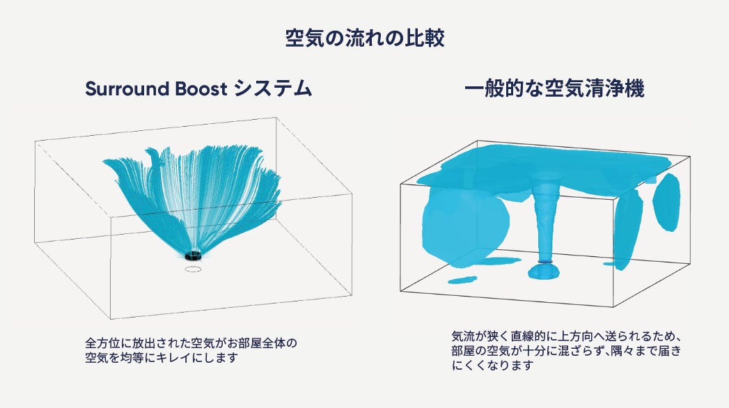 全方向へきれいな空気を供給する「Surround Boost システム」で、本体を中心に360°の広角気流を生み出します。全方位に空気が放出されるので、気流の狭い一般的な空気清浄機と比較し、部屋全体の空気を均等に清浄します。