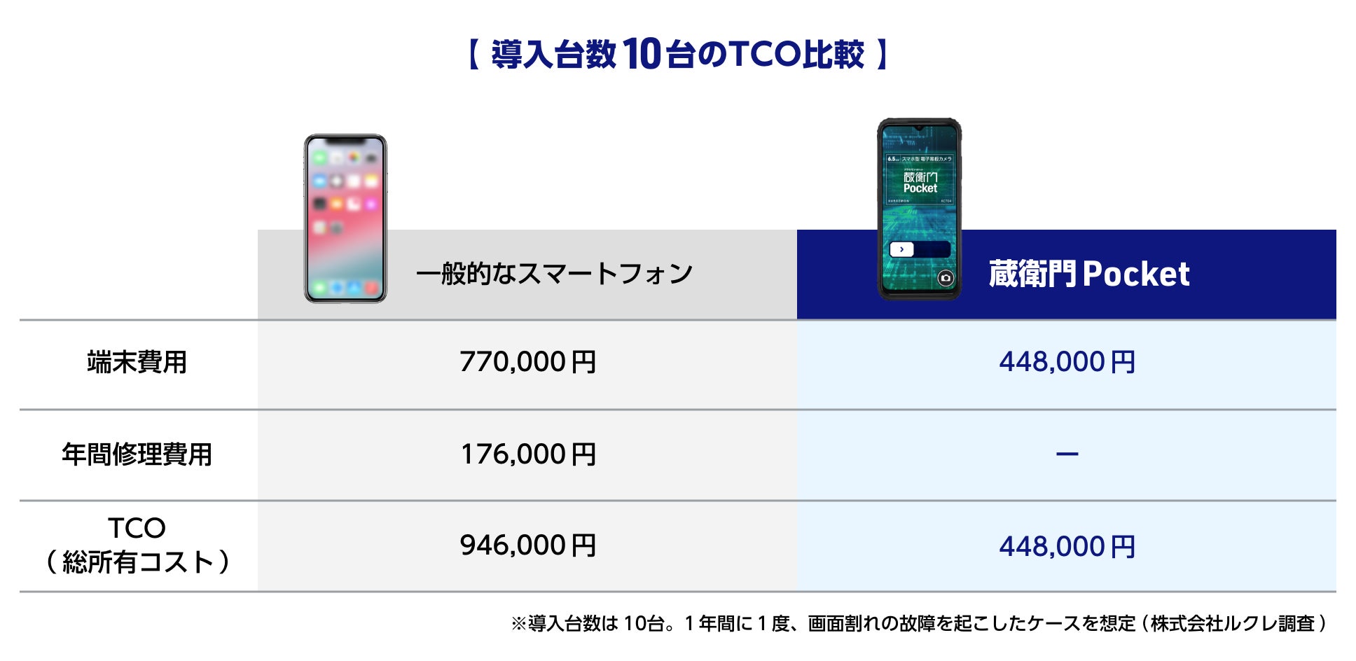 一般的なスマートフォンのTCO比較で、「蔵衛門Pocket」は年間で約52.64%の削減ができます。