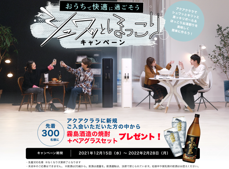 概要:期間中に本キャンペーンサイト経由でアクアクララに新規お申込みいただいた方、先着300名様に「黒霧島(25度・900ml瓶)1本、黒ッキリボールグラス2個」をセットにしてプレゼント。