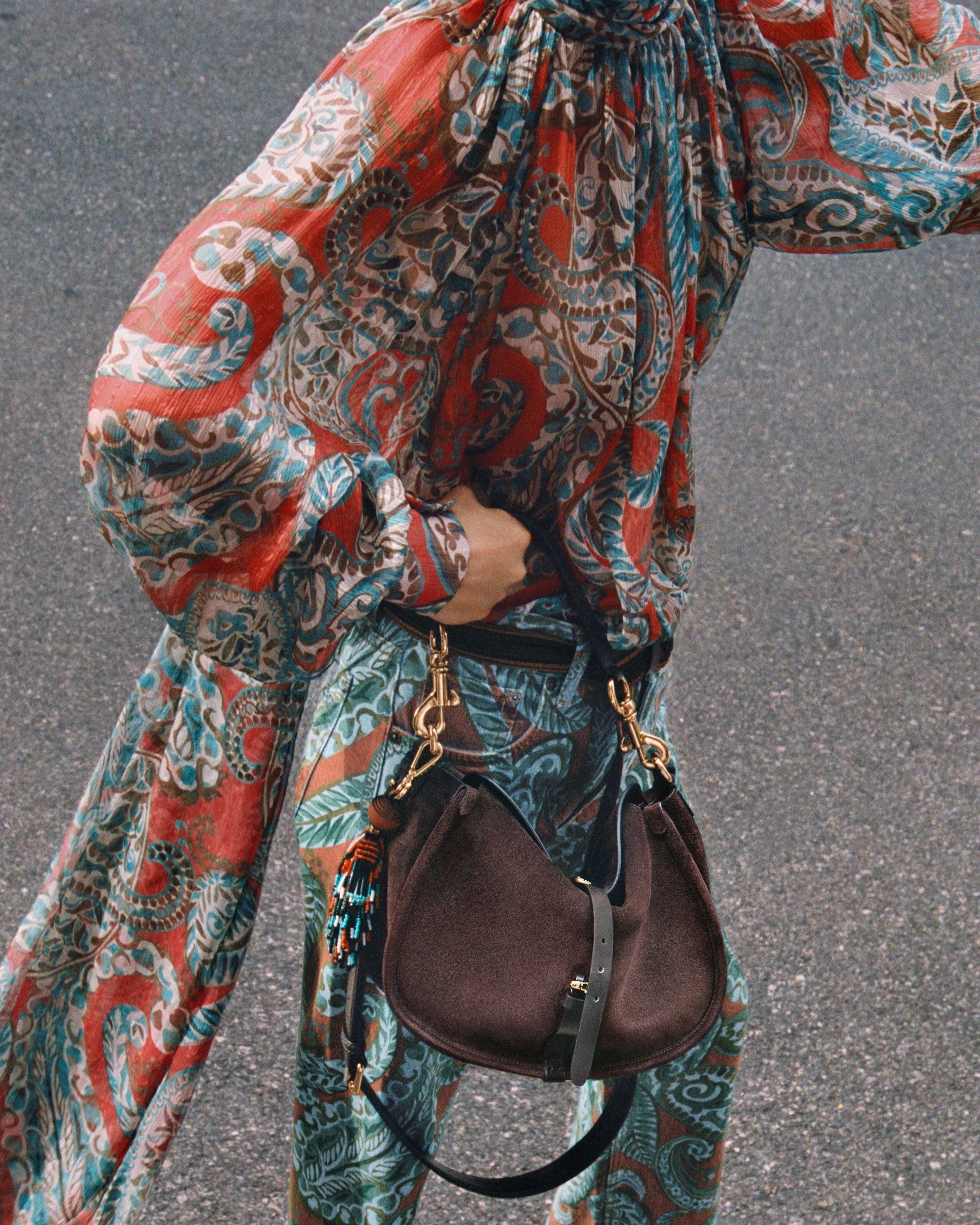 その形は、17世紀のイタリアに由来を持つレザーグッズ「カッチャトリーナ」を再解釈したもの。かつて羊飼いや農民に使われていたものが、今では、エトロの70年代ボヘミアンムードへの愛を象徴する存在として、現代的に再構築されています。