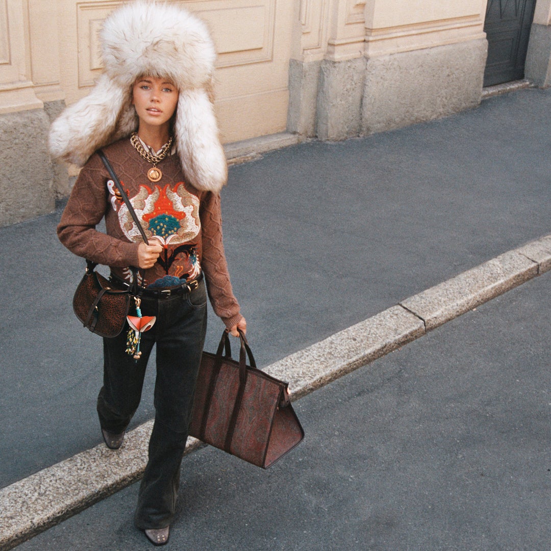 視線、一歩、しぐさ、笑顔——さまざまな瞬間と視点が、エトロのモダンな美学の多面性と、ポニーバッグに宿る活気に満ちたエクレクティックな本質を讃えています。