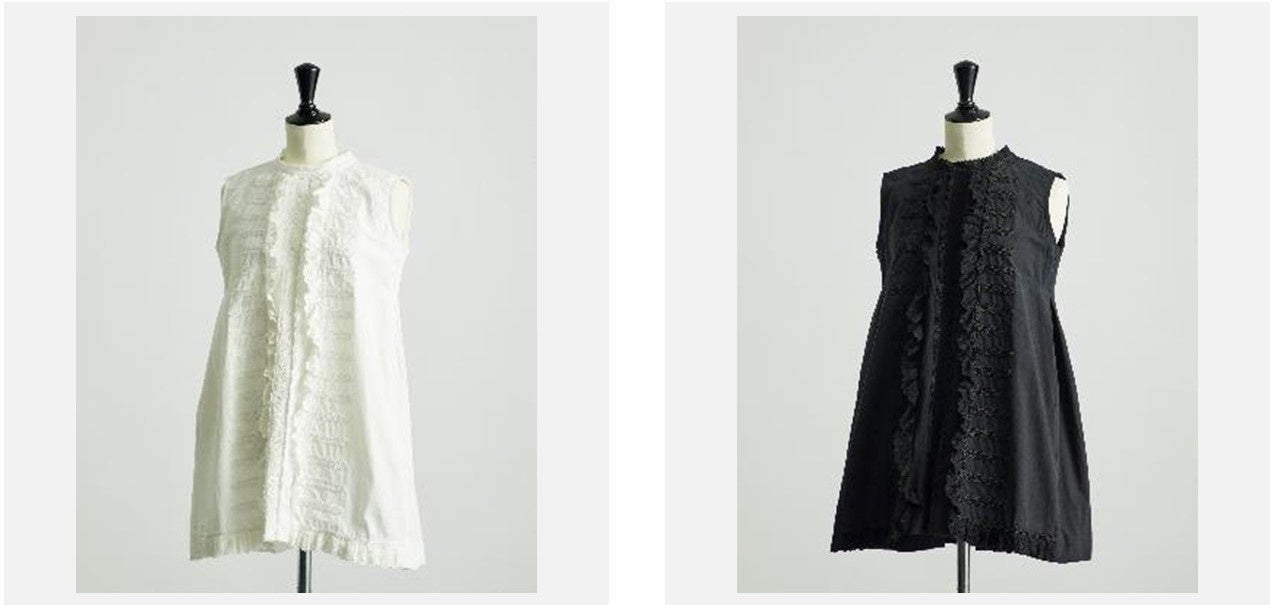 2001年にスタートしたダリアは、2人の日本人デザイナーが手掛けるデザインやバランスなどの絶妙なミックス感覚が特徴のブランド。デザイナーがストックしていたヴィンテージの子供服をベースに、チュニック丈で着られるフリルブラウスを作成しました。フロントには細かいフリルラインとミリタリー要素を感じるエンブレムを施しました。バックの高い位置から大きなタックをいれて立体感のあるフォルムに仕上がっています。
