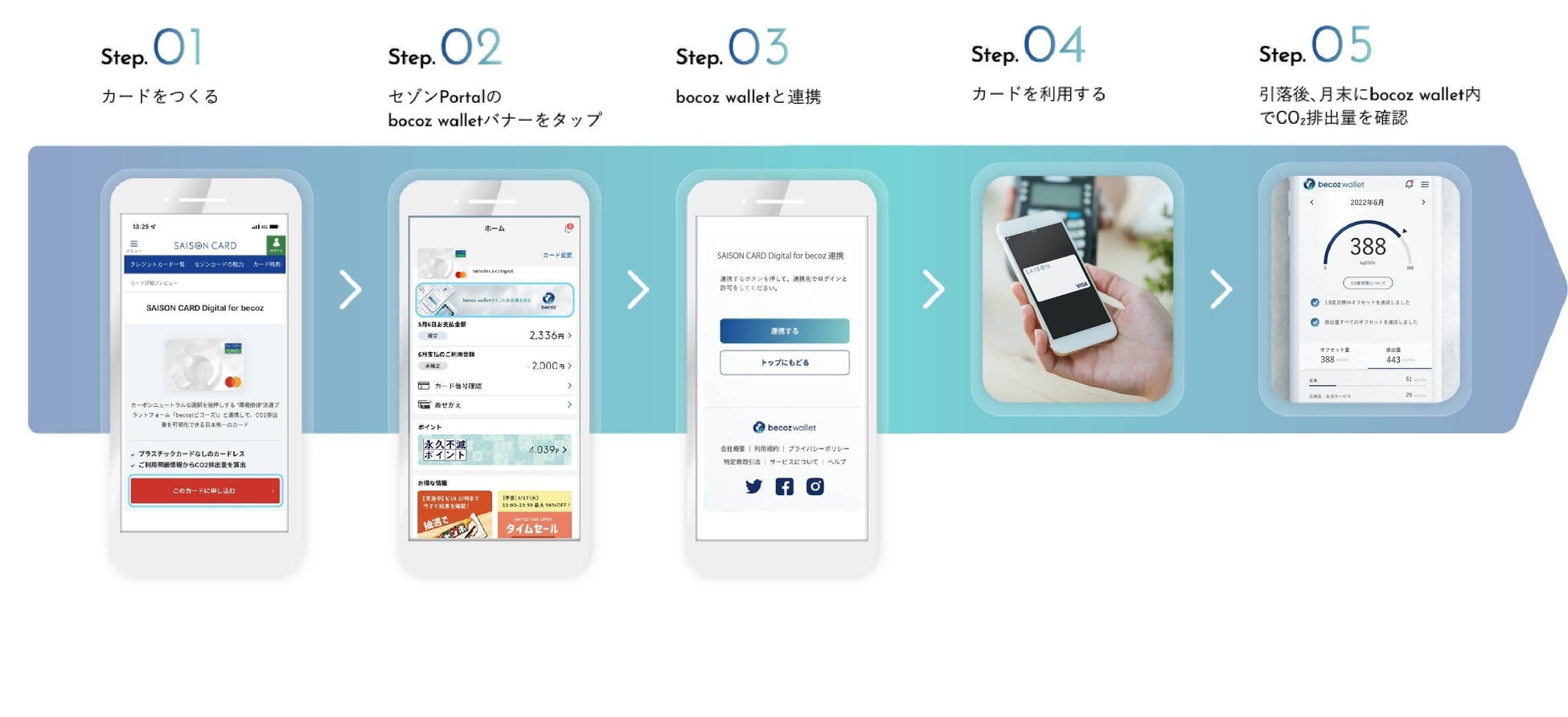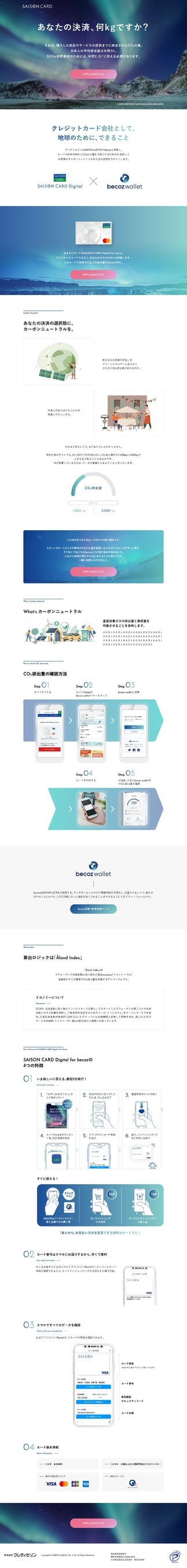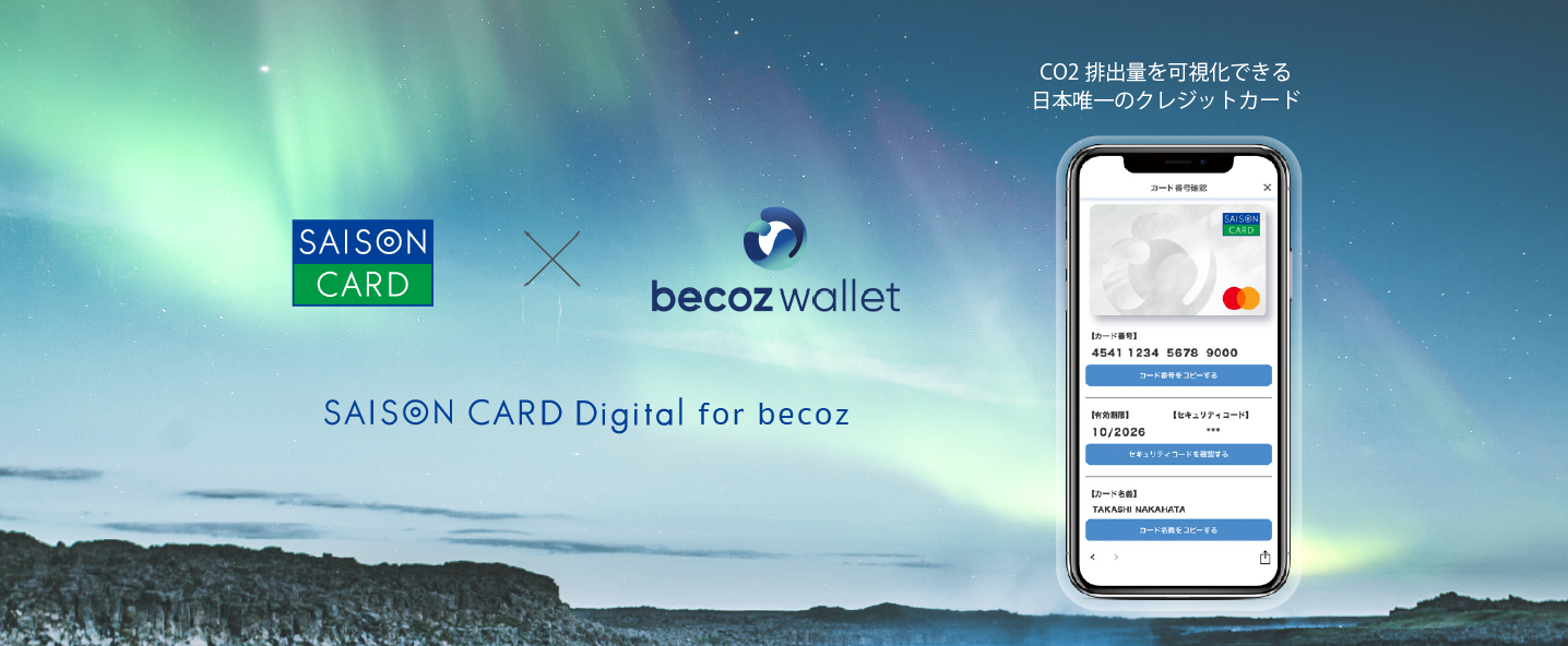 株式会社クレディセゾン(本社:東京都豊島区、代表取締役(兼)社長執行役員COO:水野 克己、以下:当社)は、データサイエンスで企業と社会の課題を解決する株式会社DATAFLUCT(本社所在地:東京都渋谷区、代表取締役:久米村 隼人、以下:DATAFLUCT)と提携し、ドコノミー(本社:スウェーデン ストックホルム、CEO:Mathias Wikström)のCO2排出量可視化に関する技術を掛け合わせ、決済データに基づきCO2排出量を可視化できる国内初※1 のクレジットカード『SAISON CARD Digital for becoz』(以下、becoz card/ビコーズカード)を6月2日(木)より発行開始いたします。 ※1 当社調べ