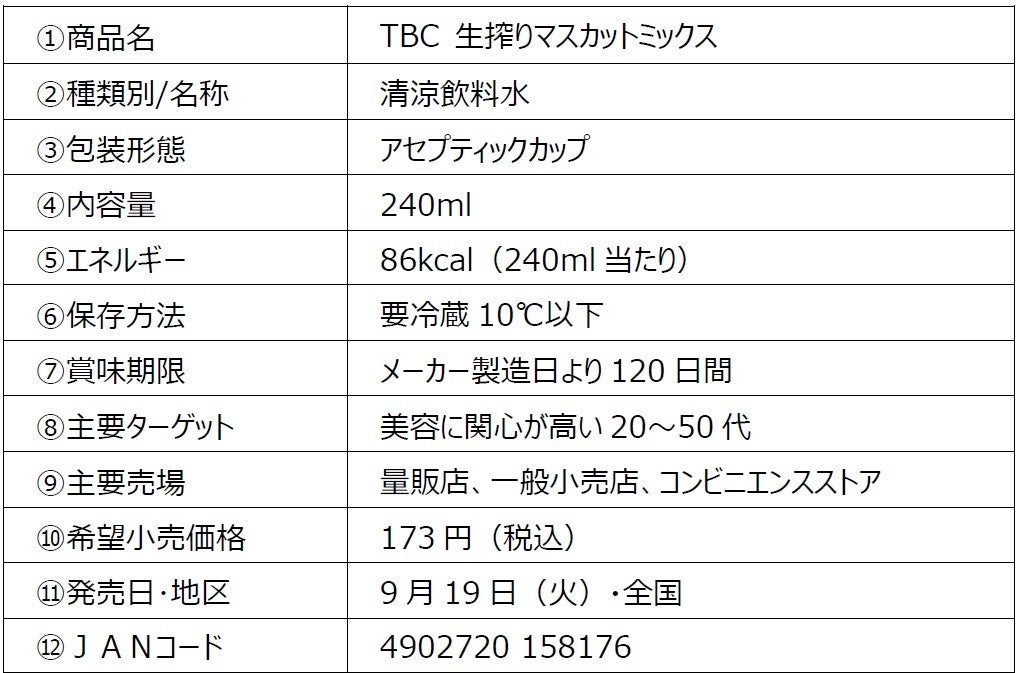 エステティックTBCと森永乳業が共同開発!美容のためのサプリメントドリンク「TBCドリンク」シリーズより「TBC 生搾りマスカットミックス」9月19日(火)新発売