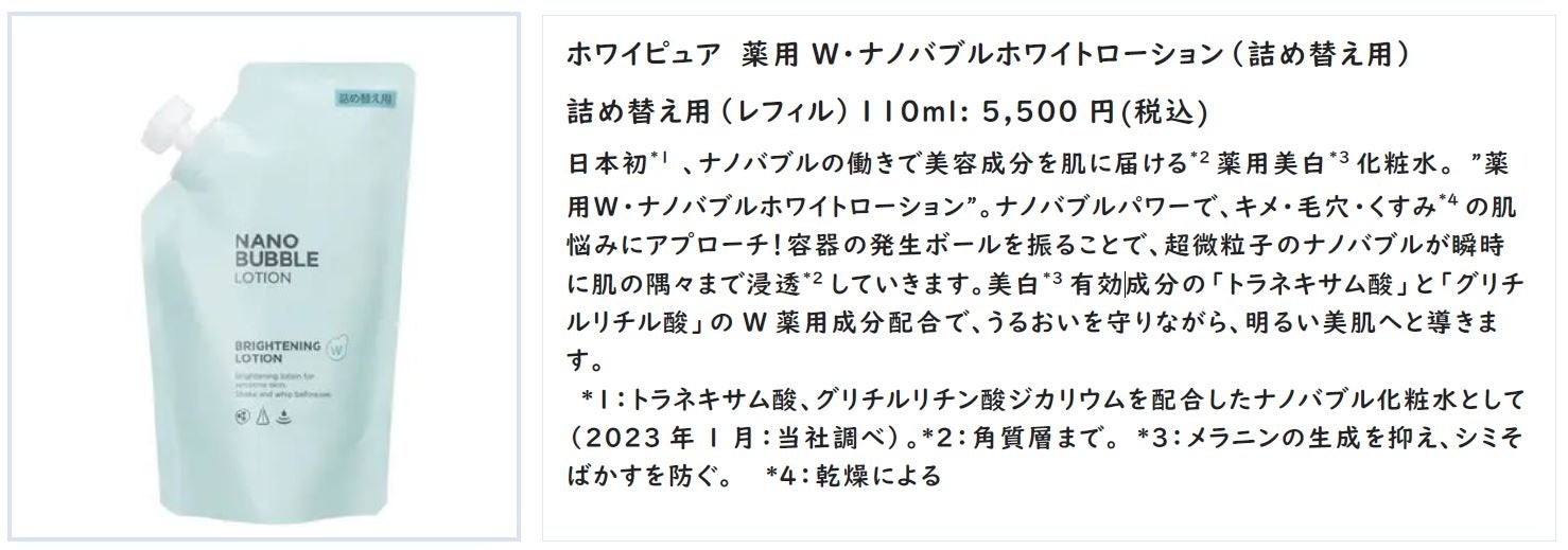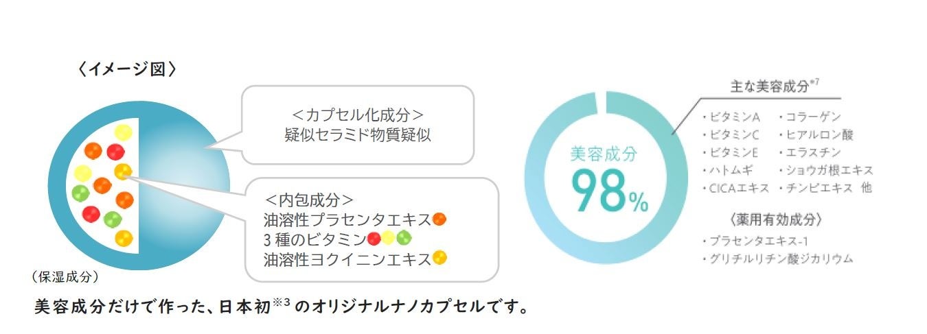 体、ビタミンC誘導体、ビタミンE)油溶性ヨクイニンエキス、油溶性プラセンタエキスを疑似セラミド物質で内包させたナノカプセル】を開発し、その配合処方として。2023年1月現在(当社調べ)