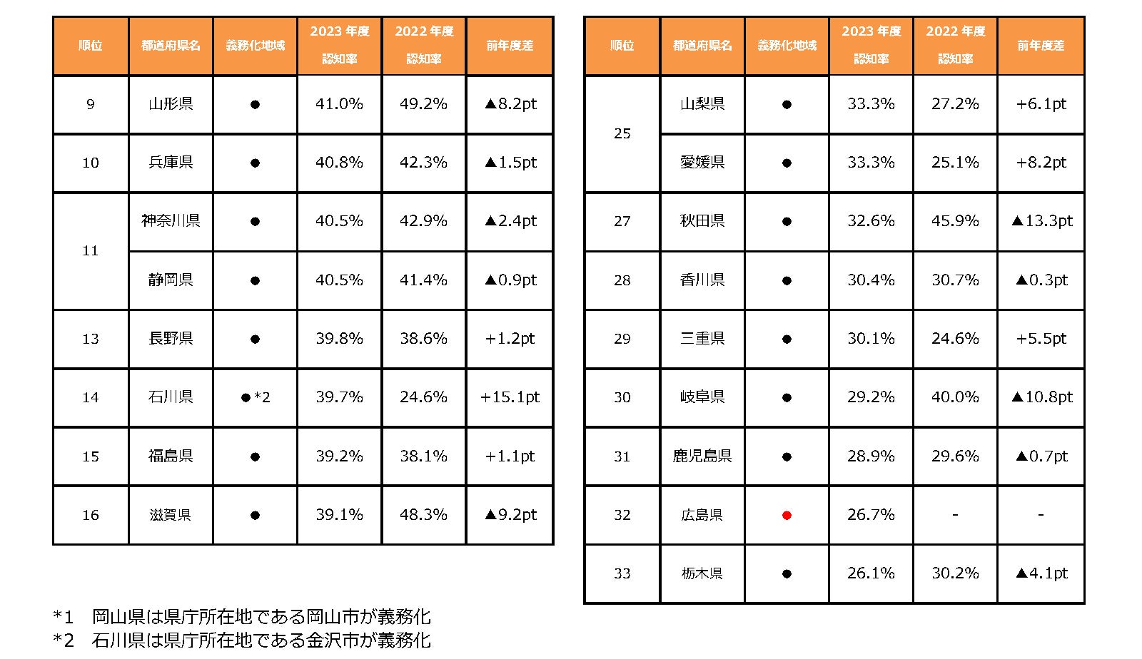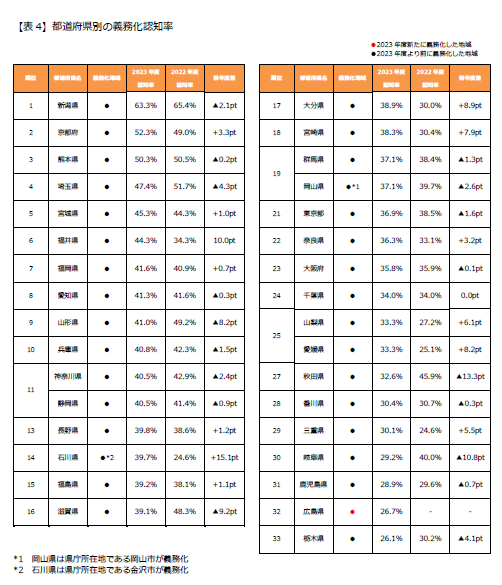 (注)本リリースにおける「義務化地域」には、都道府県単位で義務化している宮城県、秋田県、山形県、福島県、栃木県、群馬県、埼玉県、千葉県、東京都、神奈川県、新潟県、福井県、山梨県、長野県、岐阜県、静岡県、愛知県、三重県、滋賀県、京都府、大阪府、兵庫県、奈良県、広島県、香川県、愛媛県、福岡県、熊本県、大分県、宮崎県、鹿児島県、および市単位で義務化している岡山県(岡山市)、石川県(金沢市)を含みます。