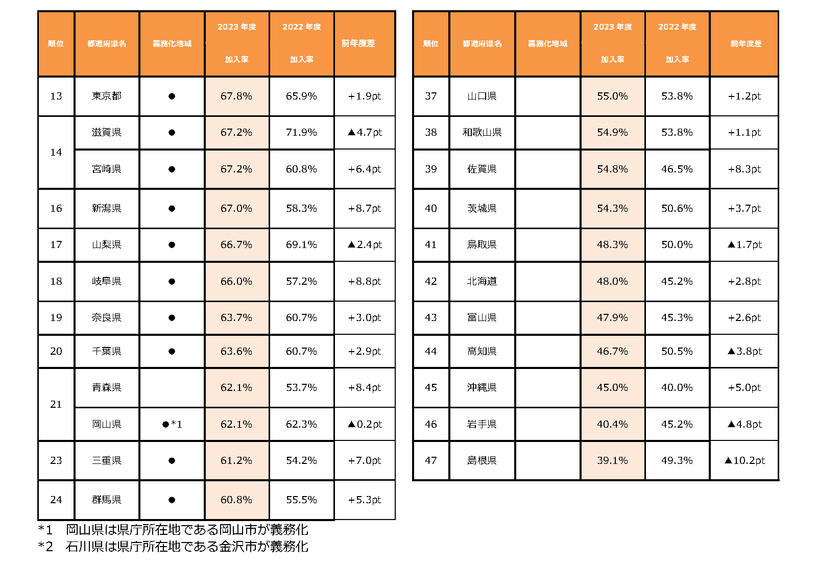 2019年度は1.3ポイント、2020年度は2.2ポイント、2021年度は3.1ポイントと年々加入率の伸び幅が拡大してきましたが、2022年度は0.9ポイントと過去最小の伸び幅になりました。しかし、2023年度は2.1ポイント上昇となり、再び伸び幅が拡大しました。