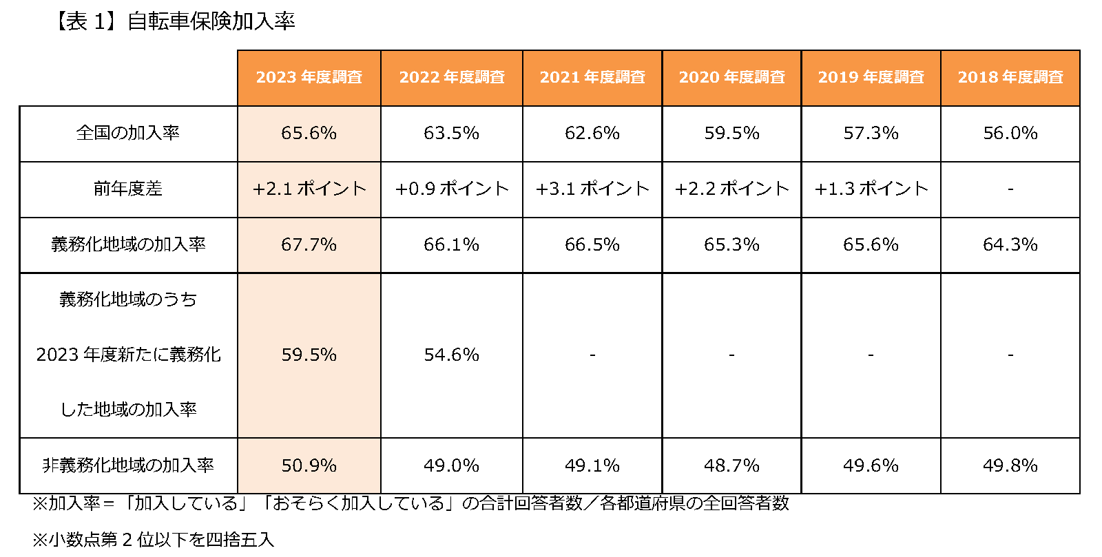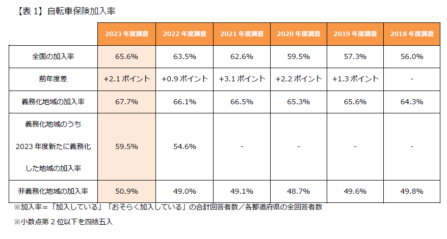 1. 自転車保険への加入率が全国で65.6% 【表1】