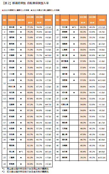 地域別の自転車保険加入状況は、義務化地域(注)が67.7%、義務化していない地域が50.9%と義務化の有無で大きな差が出ています。なお、都道府県別では、熊本県が加入率77.1%でトップとなりました。2023年度に新たに自転車保険への加入を義務化した広島県の加入率は59.5%で、昨年度から4.9ポイント上昇しました。
