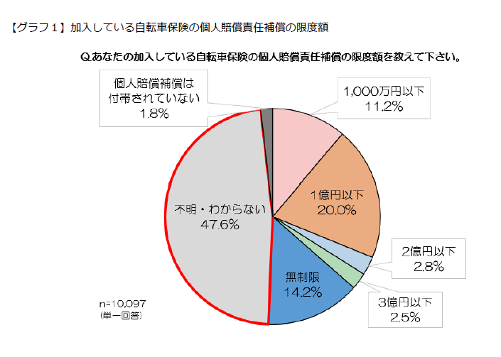 自転車保険に加入している方に、加入している保険の個人賠償責任補償の限度額について調査したところ、一番多かった回答は「不明・分からない」で47.6%でした。