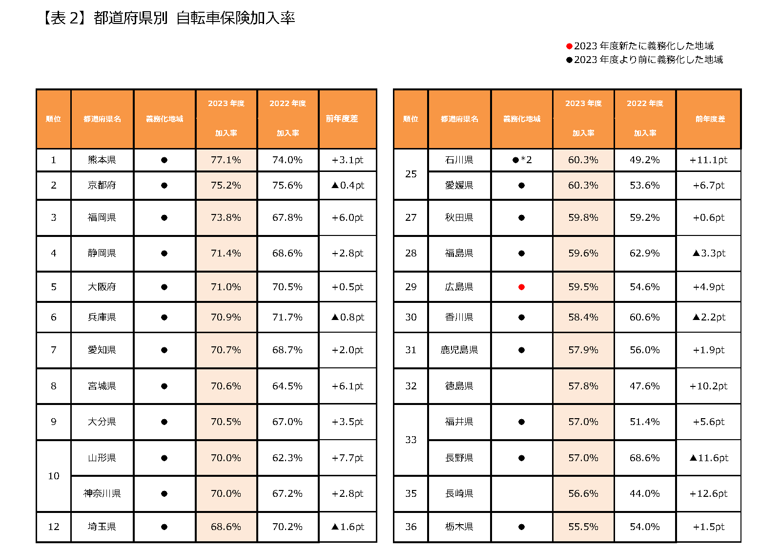 2. 自転車保険の加入義務化と加入率【表1】【表2】
