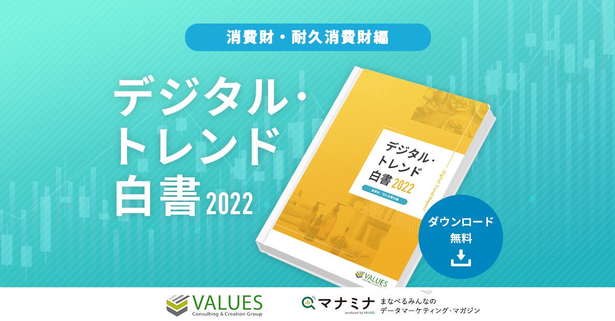 インターネット行動ログ分析によるマーケティング調査・コンサルティングサービスを提供する株式会社ヴァリューズ(本社:東京都港区、代表取締役社長:辻本 秀幸、以下「ヴァリューズ」)は、当社が運営するデータマーケティング・メディア「マナミナ」にて2021年1月~2022年5月に公開した約300本におよぶ調査から厳選し、国内消費者のデジタル動向をまとめた「デジタル・トレンド白書2022 - 消費財・耐久消費財編 -」を公開しました。