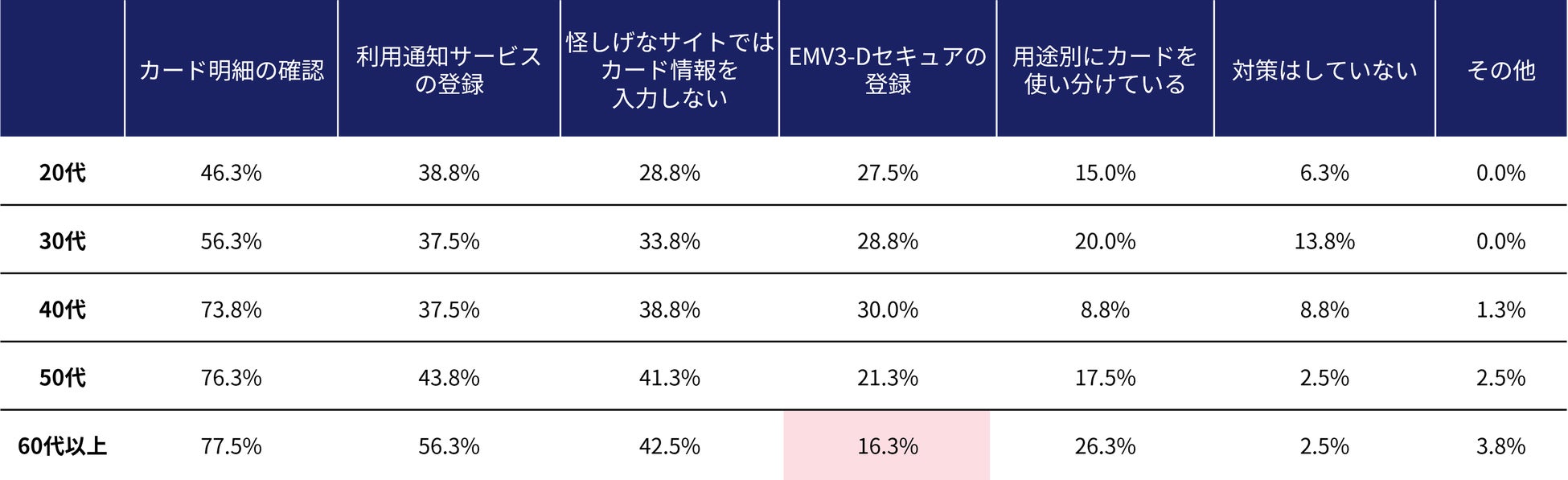 また、国が推奨する「EMV3-Dセキュアの登録」においては、20〜40代の約30%が登録している一方で、60代以上はわずか16.3%にとどまりました。この結果は、高齢層における「EMV3-Dセキュアの登録」の浸透が課題になっていることが推測されます。