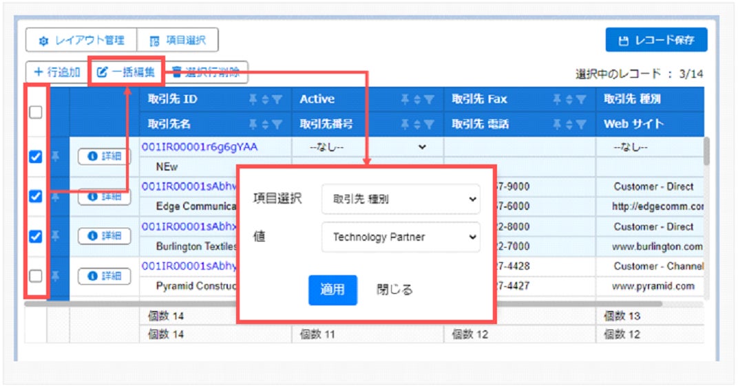フレキシブルデータテーブルに一括編集機能が追加され、チェックボックスをONにした複数行の項目の一括編集が可能となりました。