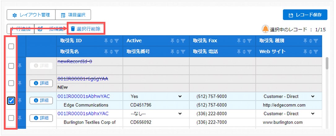 - チェックボックスをONにした複数行を一括で削除指定が可能