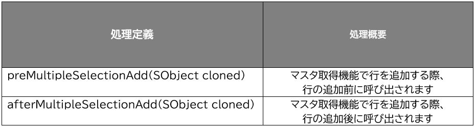 カスタムルックアップ画面からデータテーブルに行追加(マスタ取得)する際、行の追加前・追加後のタイミングで拡張Apexクラスの処理を実行可能になりました。